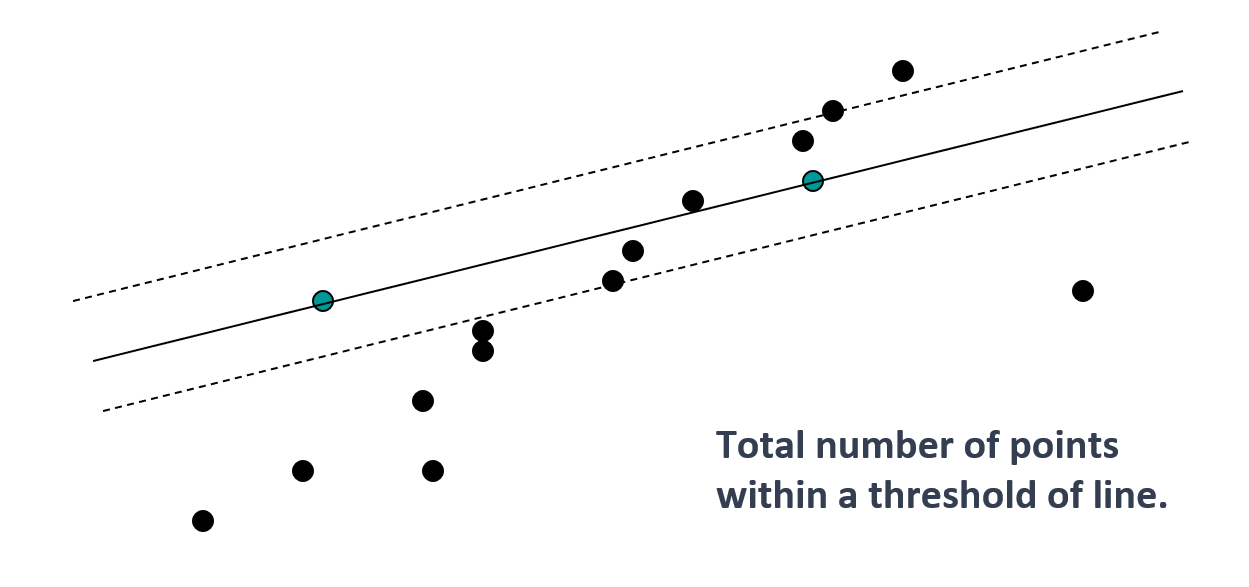 - 如果离群点被选中计算当前的匹配,那么回归出来的线肯定不足以支撑剩下点的匹配,和通过内在点得到的线有很大的差异。