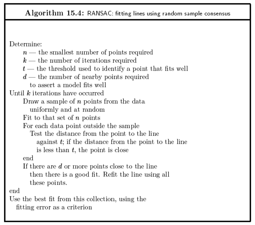 - RANSAC 将数据划分为内在点和离群点,并根据内在点的极小集合得到估计值