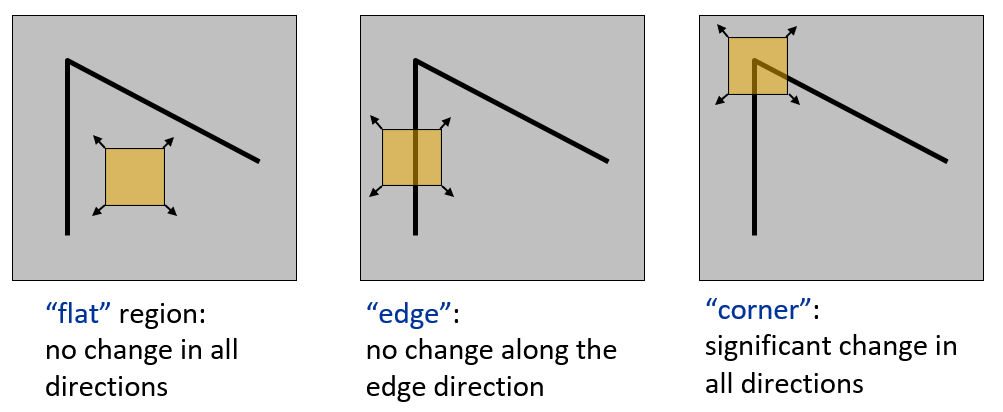- 平坦区域(flat region):无论向何种方向移动窗口,窗口内的像素都没有发生变化