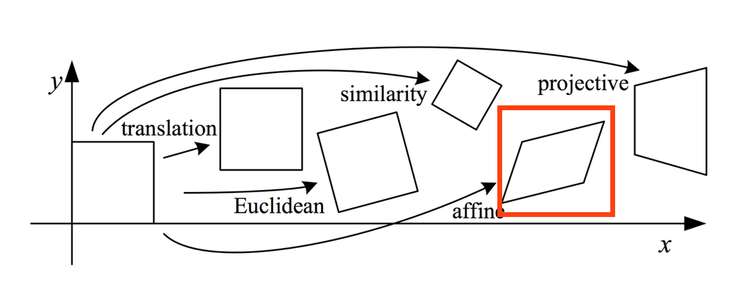- 拟合的变换矩阵:\(H = \begin{bmatrix}h_{11} & h_{12} & h_{13} \\ h_{21} & h_{22} & h_{23} \\ 0 & 0 & 1\end{bmatrix}\),一张图像上所有像素点共享这个变换矩阵