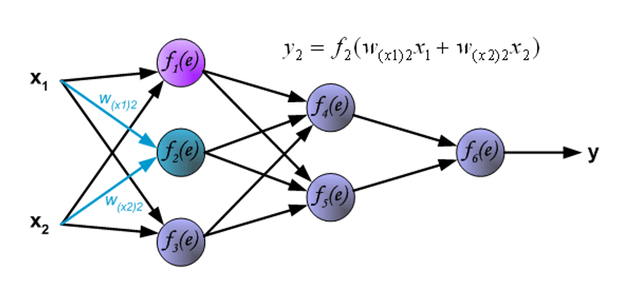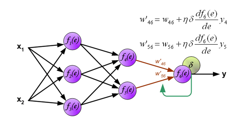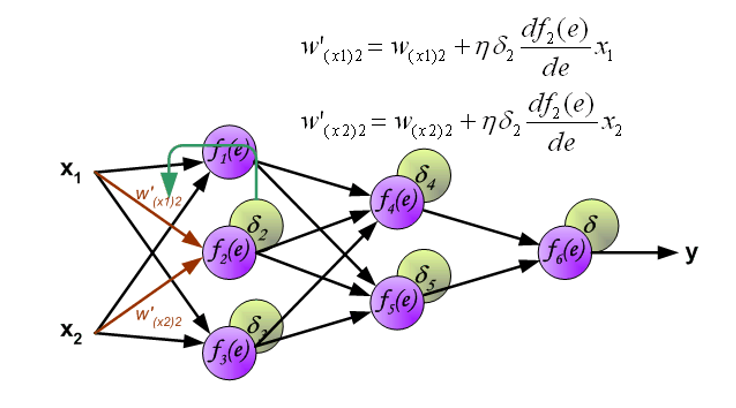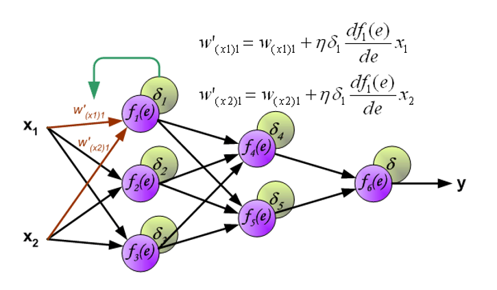 当每个神经元的误差计算完毕时,每个神经元输入节点的权重系数可能需要被修改。在下面给出的公式中,\(\dfrac{\text{d}f(e)}{\text{d}e}\) 表示神经元激活函数的导数。