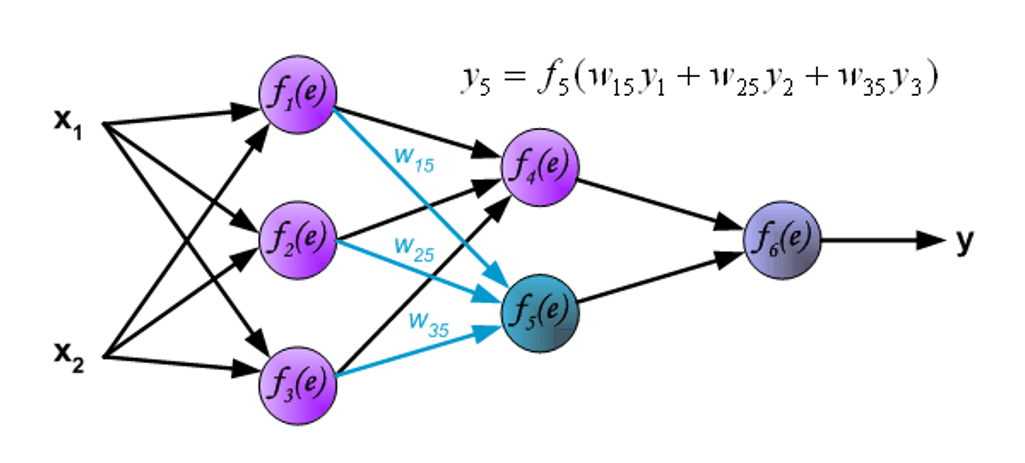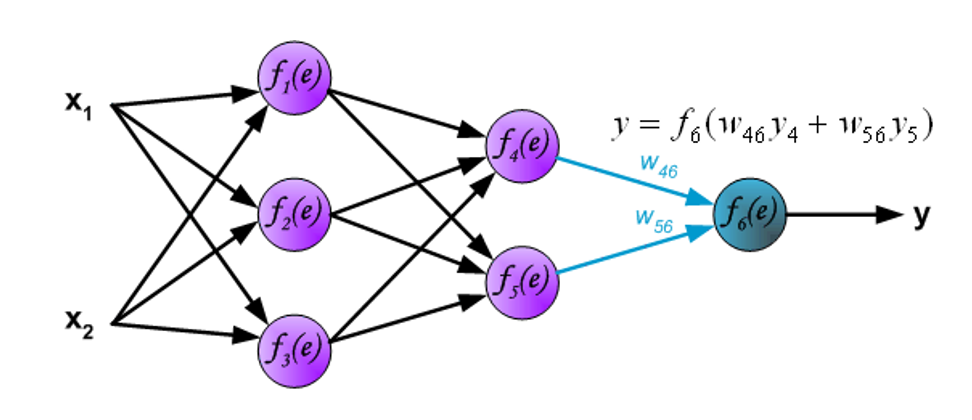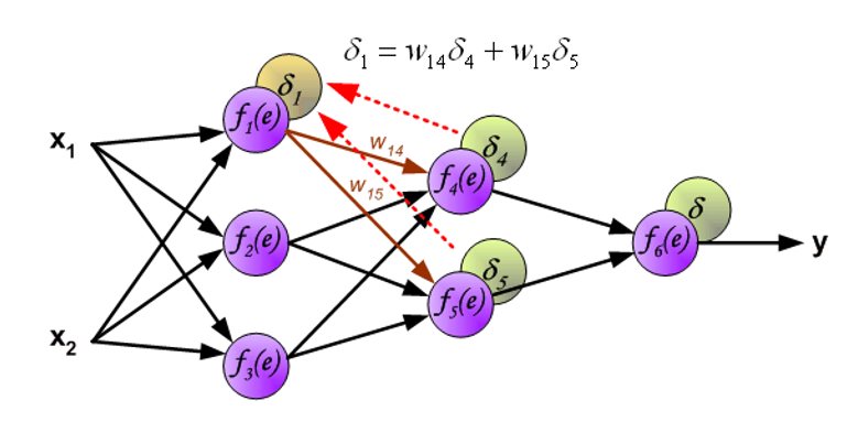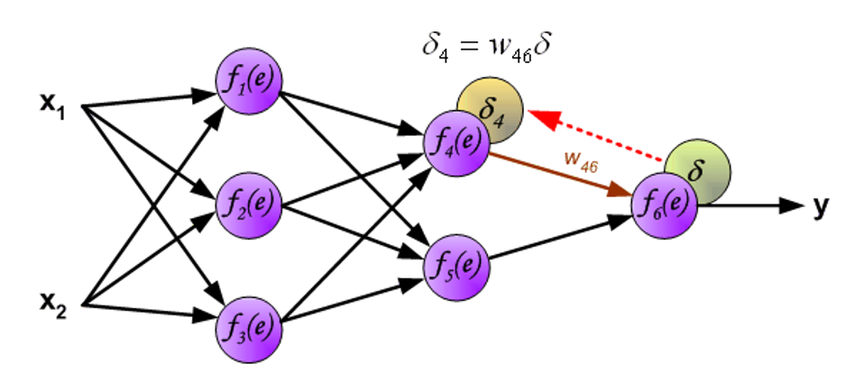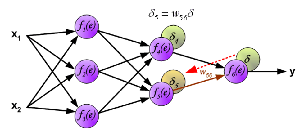 用于反向传递误差的权重系数 \(w_{mn}\) 等于在计算输出值时用到的权重值,改变的只是数据流方向。这种方法可用于所有的网络层。如果被传递的误差来自多个被加入的神经元,那么处理方式如下所示: