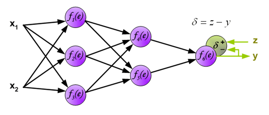现在将在网络中 \(y\) 的输出信号与预期输出值(目标,来自训练好的数据集)\(z\) 进行比较,它们的差值称为输出层神经元的误差信号 \(d\)
