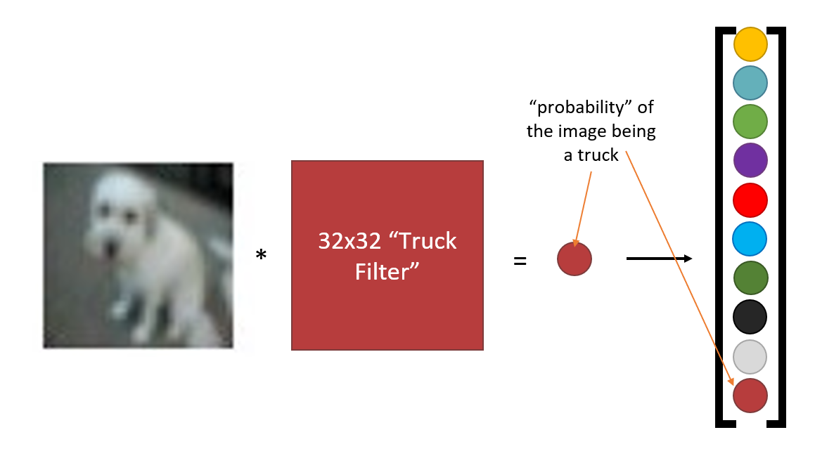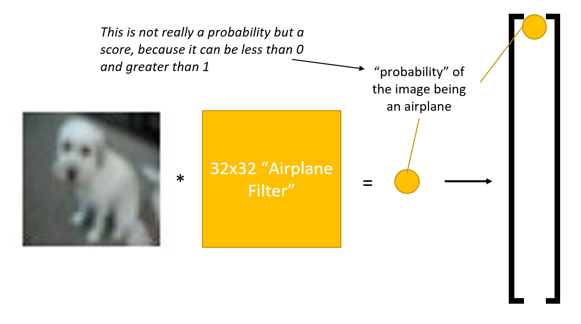 • 对于一张图片,需要使用多种不同的滤波器,每个滤波器代表一类图像,图片与滤波器的运算结果是一个“概率”值,但是这个“概率”可以 <0 >1,因此更确切的说法是“分数”