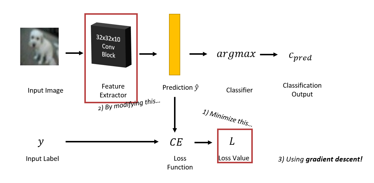 • 减小 \(L\) 的方法:梯度下降法(gradient descent),梯度通过上面介绍过的反向传播 (back propagation) 获得