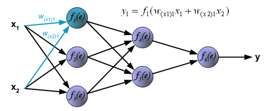 下图展示信号在网络间的传播,\(w_{xm}n\) 表示输入 \(x_m\) 和输入层的神经元 \(n\) 之间的连接的权重,\(y_n\) 表示神经元 \(n\) 的输出信号。