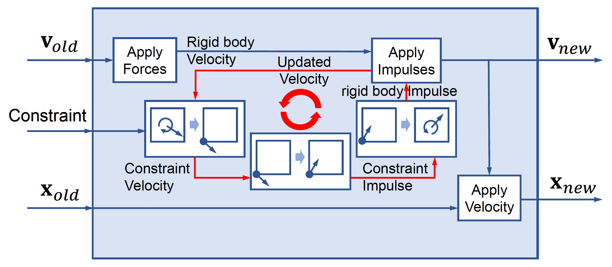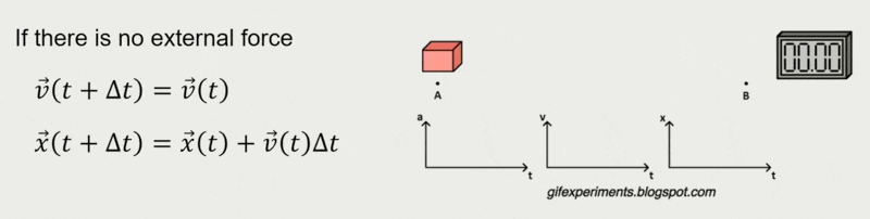 \[ \begin{cases} \vec{v}(t_{1}) = \vec{v}(t_{0}) + M^{-1}\textcolor{cornflowerblue}{\vec{F}(t_{0})}\Delta t \\ \vec{x}(t_{1}) = \vec{x}(t_{0}) + \textcolor{cornflowerblue}{\vec{v}(t_{0})}\Delta t \end{cases} \]其中标蓝的量表示当前状态,它们都是已知的。
