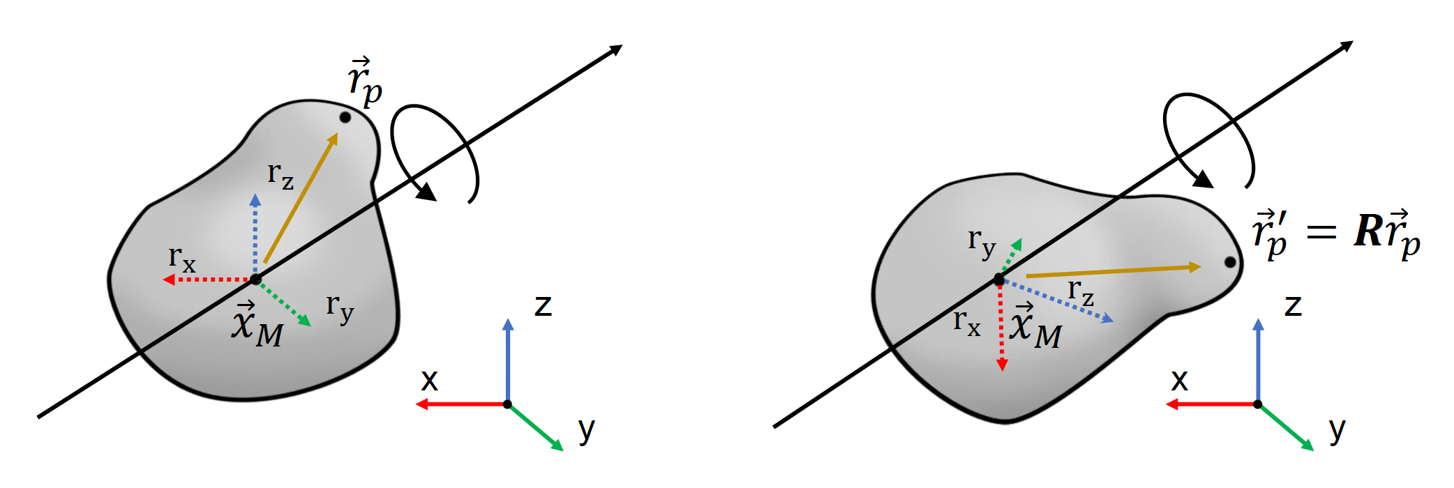 \[ \bm{I} = \bm{R} \cdot \bm{I}_0 \cdot \bm{R}^\top \]- 总质量:\(M = m_1 + m_2\)