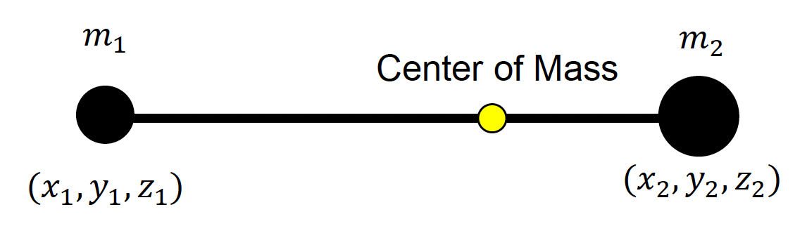 - 质心:\(CoM = \dfrac{m_1}{M}(x_1, y_1, z_1) + \dfrac{m_2}{M}(x_2, y_2, z_2)\)