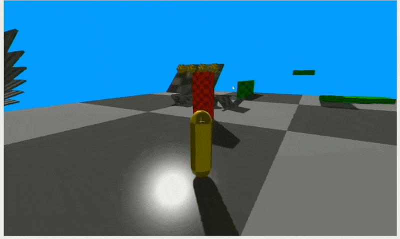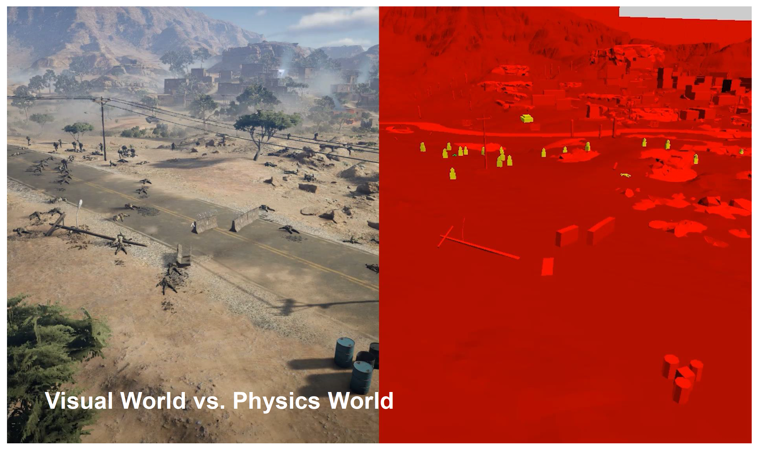 如下图所示,左图是渲染后的虚拟世界;而右图是物理世界,游戏的逻辑和模拟往往在这之上运行的。