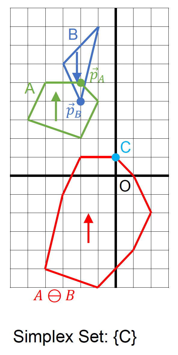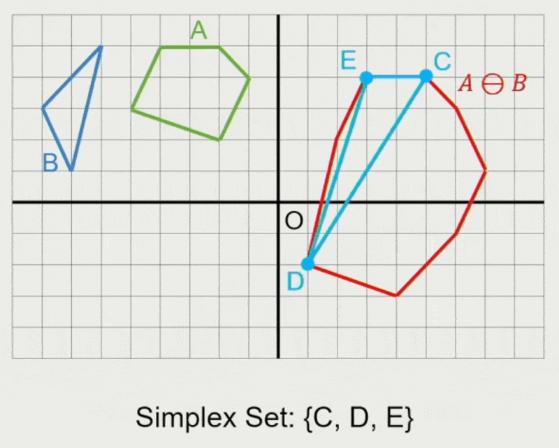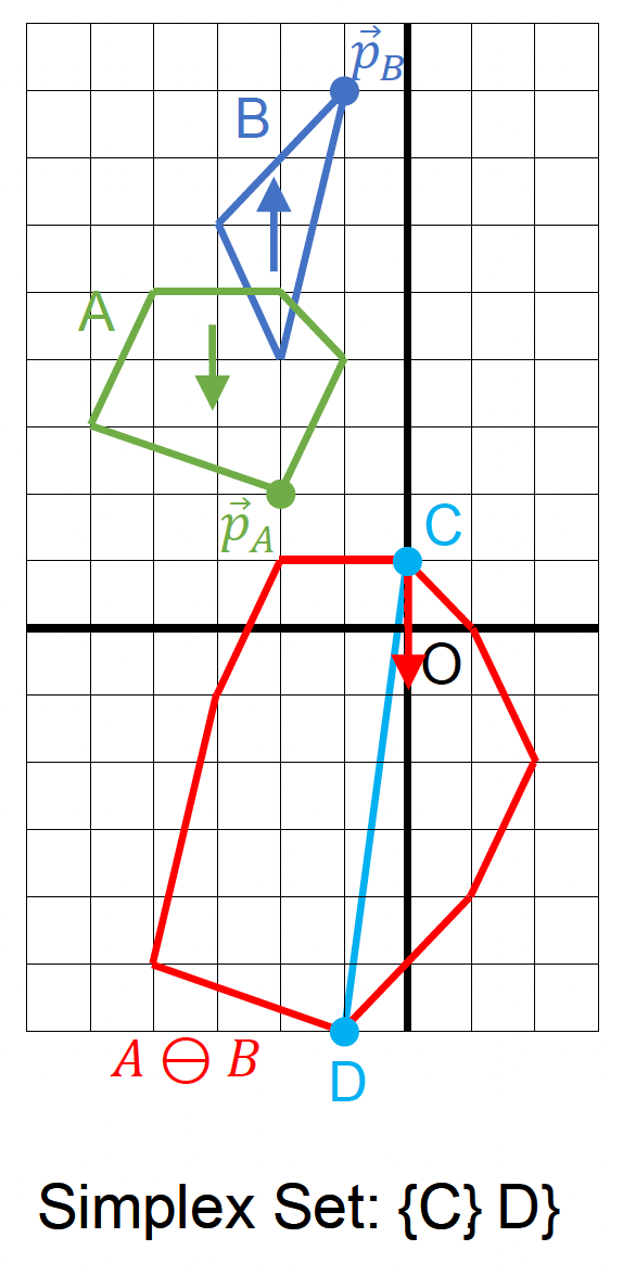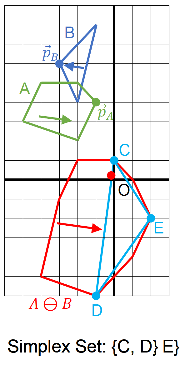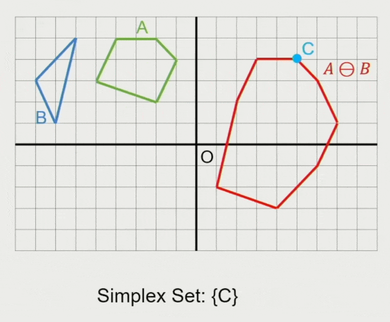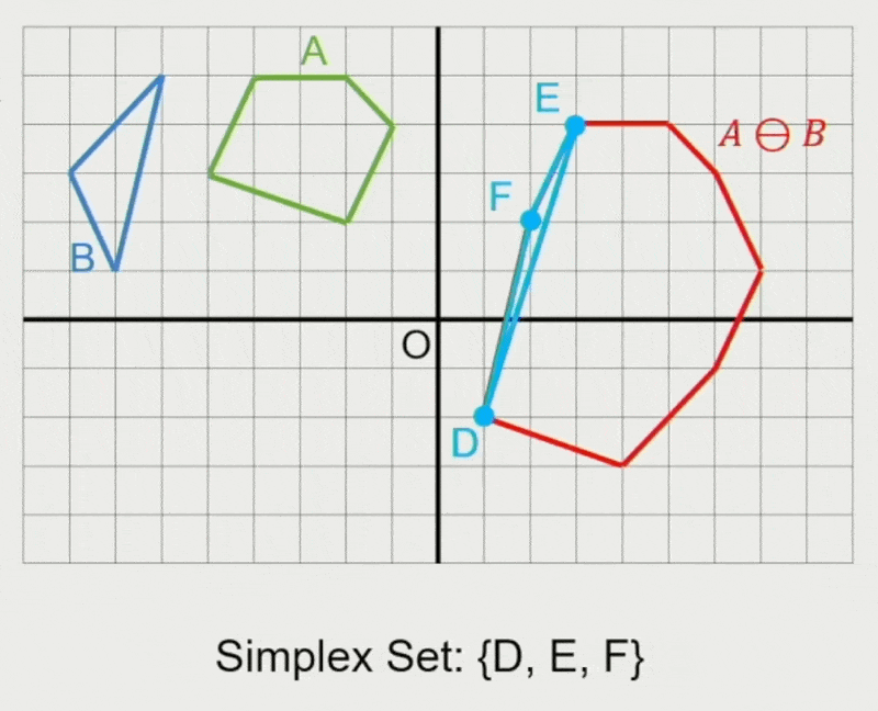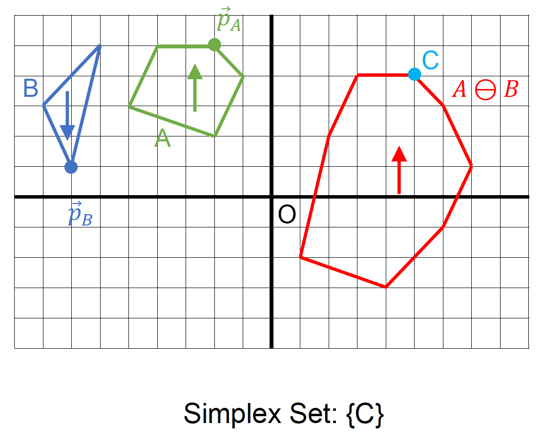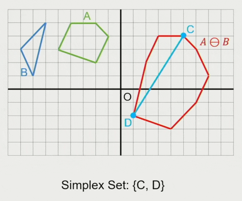 - 在闵可夫斯基差上向迭代单纯形添加新点 \(\vec{p}_A - \vec{p}_B\)