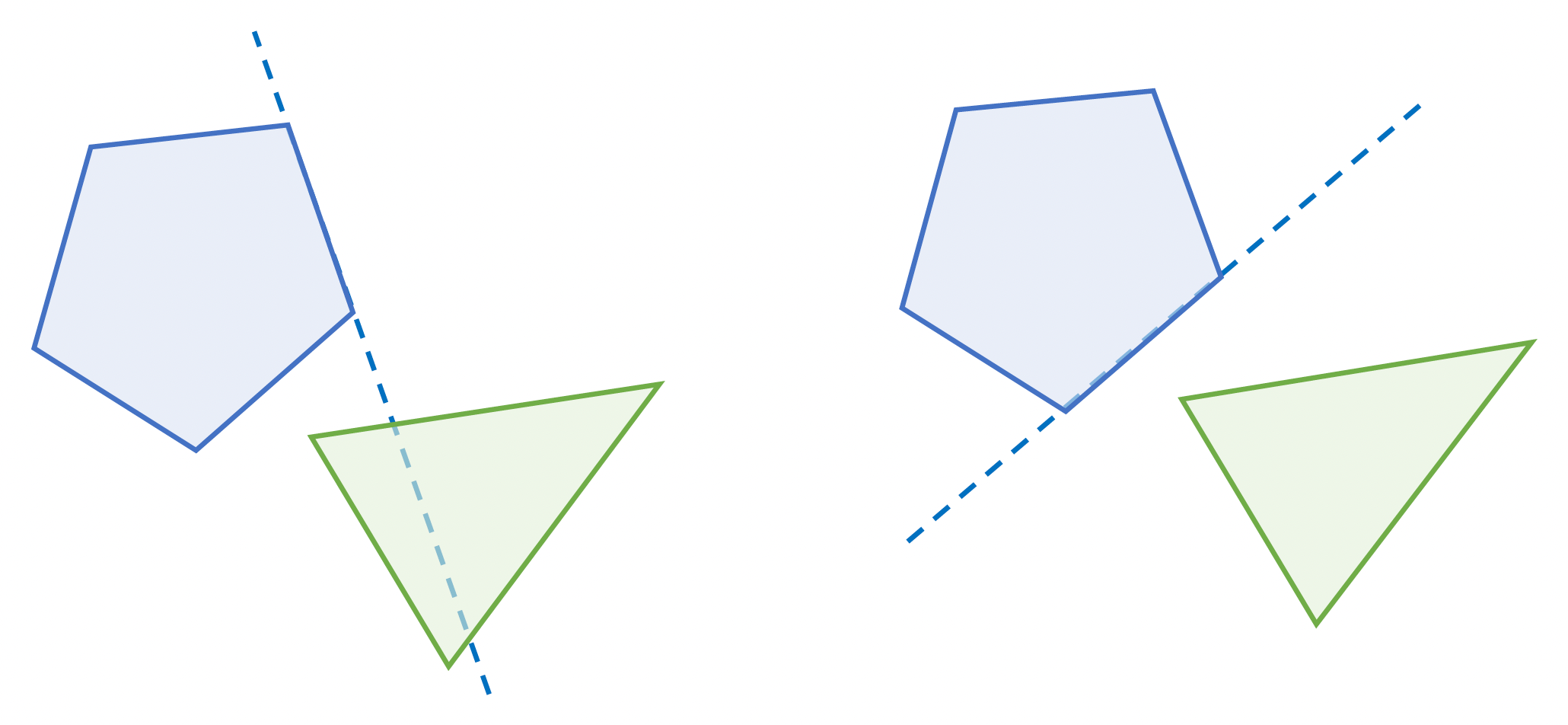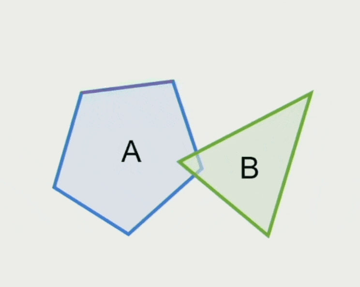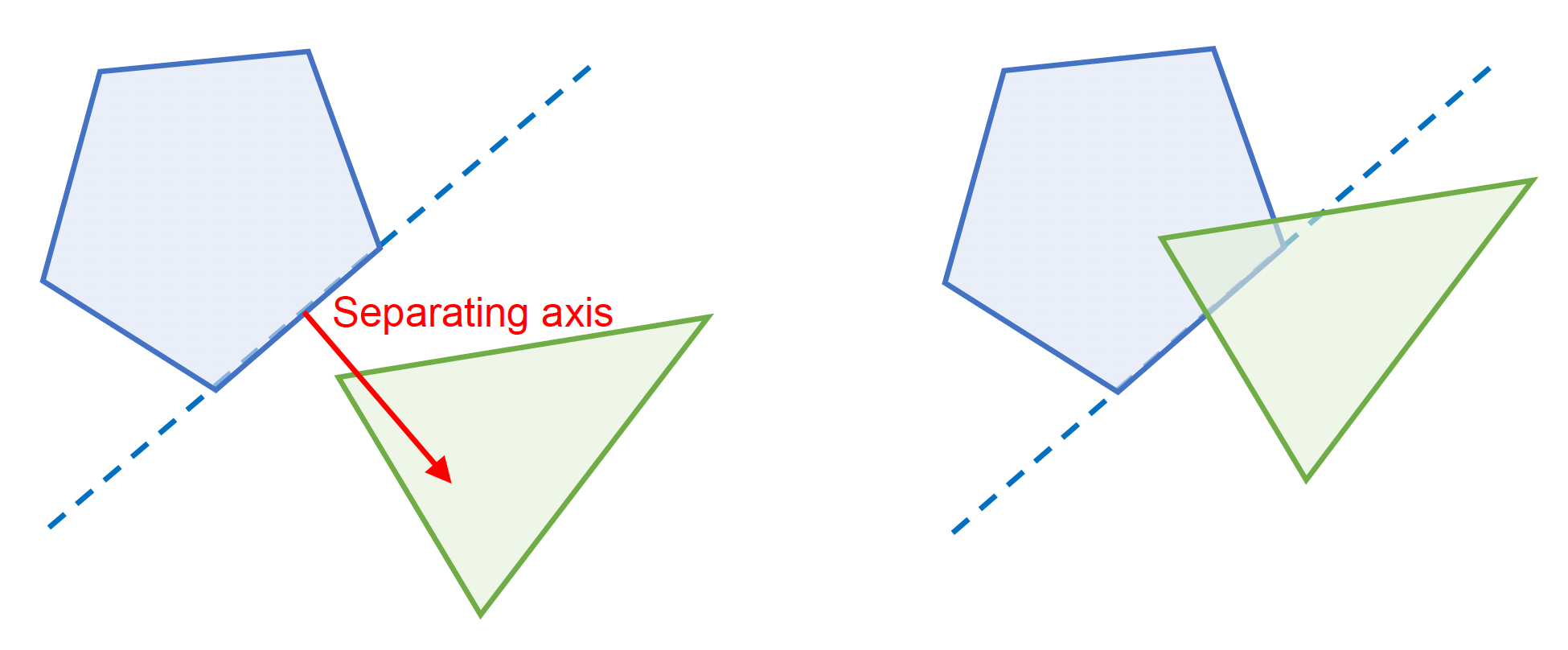 另一种理解:在 2D 情况下,一定能找到一条轴,使得两个多边形的顶点在这条轴上的投影是分离的(两个投影顶点集合没有交集)