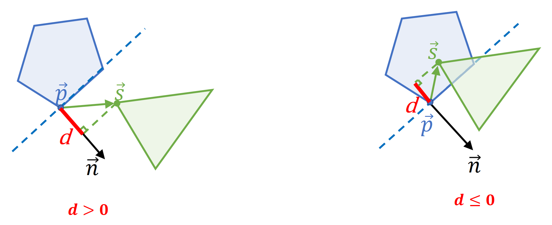 分离标准:\(\textcolor{red}{d} = \vec{n} \cdot (\textcolor{yellowgreen}{\vec{s}} - \textcolor{cornflowerblue}{\vec{p}})\),穿透深度就是 \(|d|\)