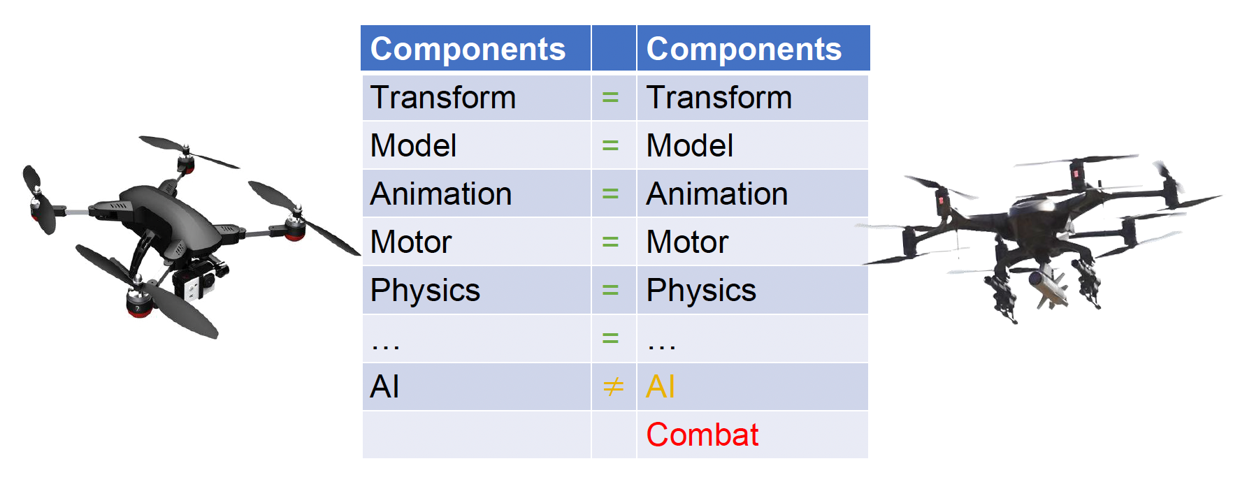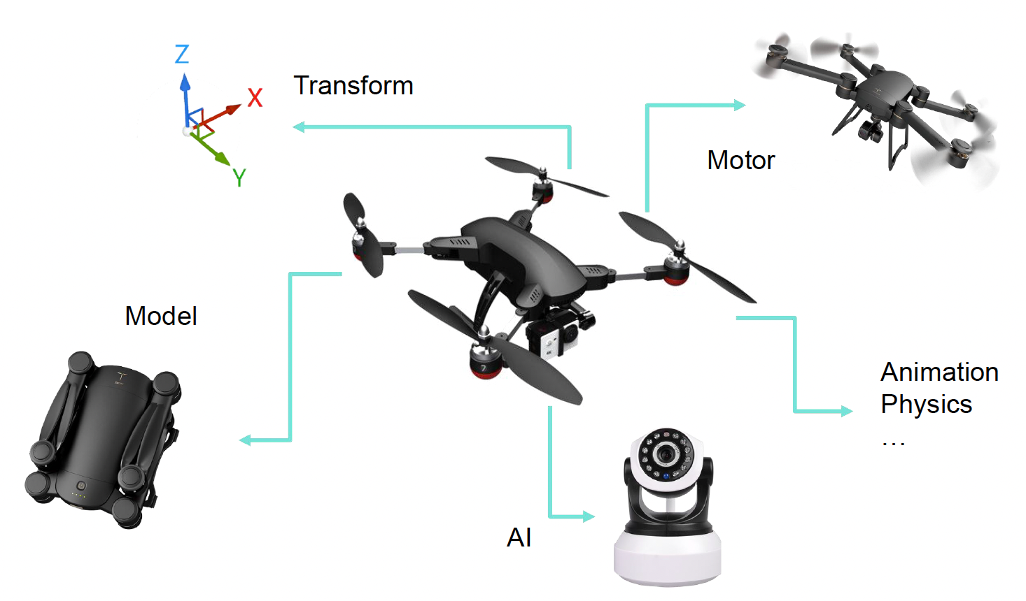 对于前面无人机的例子,我们可以把它拆分为诸如模型、马达 (motor)、AI 等部件。