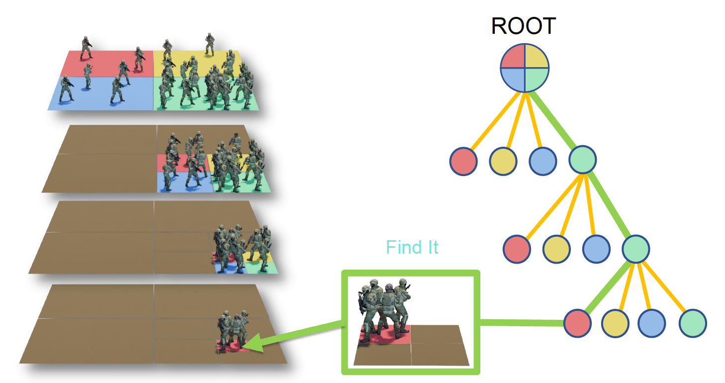 - 四叉树(quadtree):将空间划分成四块,不断划分,直至空间内对象足够少