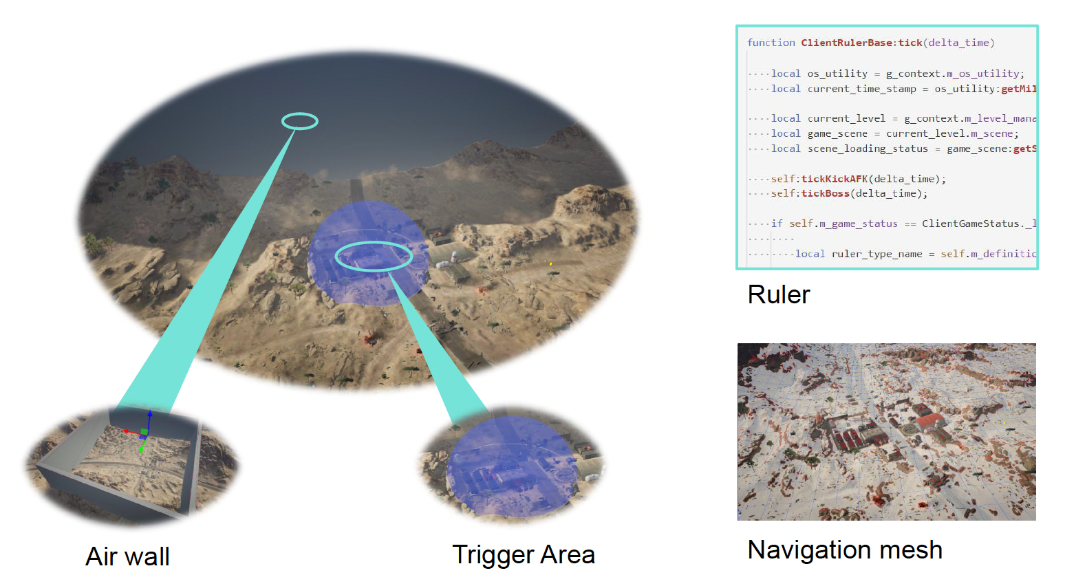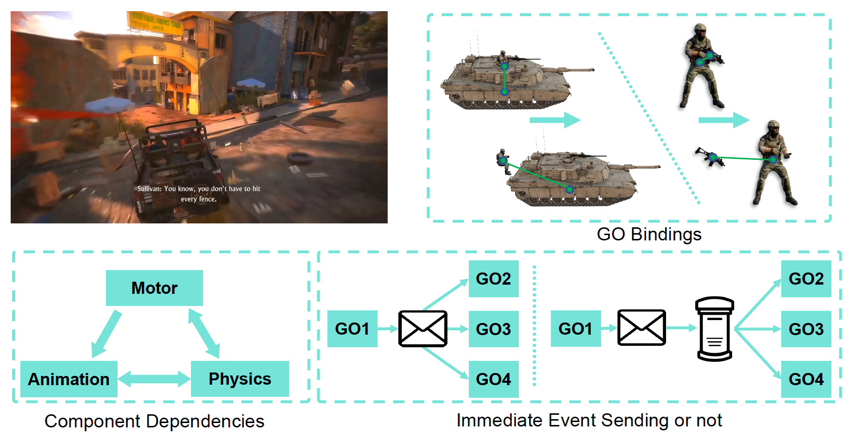 游戏对象之间常常存在绑定关系,例如角色与车辆之间的关系,因此 tick 时必须保证正确的先后顺序:父对象先更新,子对象再根据父对象的最新状态更新。商业引擎为了提高性能,会将 tick 分发到多个 CPU 并行执行,使得时序控制变得更加复杂。如果不加限制,对象之间在同一帧互相发送事件时可能出现逻辑悖论,导致结果无法确定。