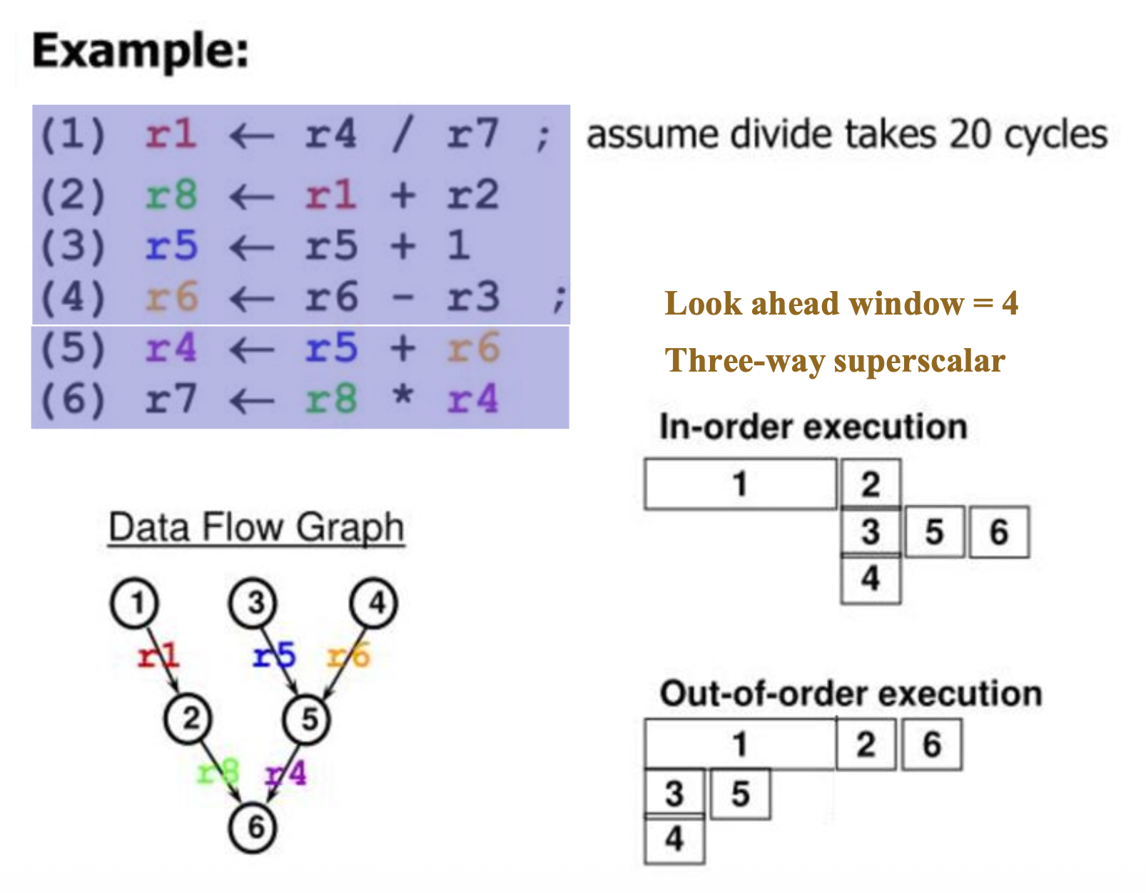 解决方案是乱序执行(out-of-order execution):基于数据流图(data flow graph) 而非程序顺序执行指令,并提前观察滑动窗口内的所有指令,找出那些准备就绪的指令,先让它们执行