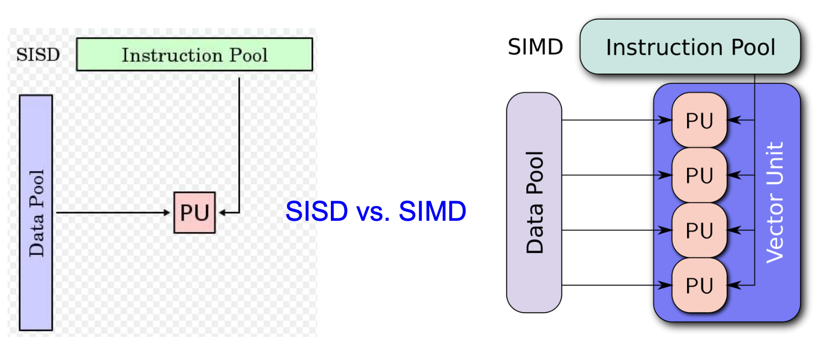 相比 SISD,一个 SIMD 计算单元可同时对多个数据项执行相同的运算