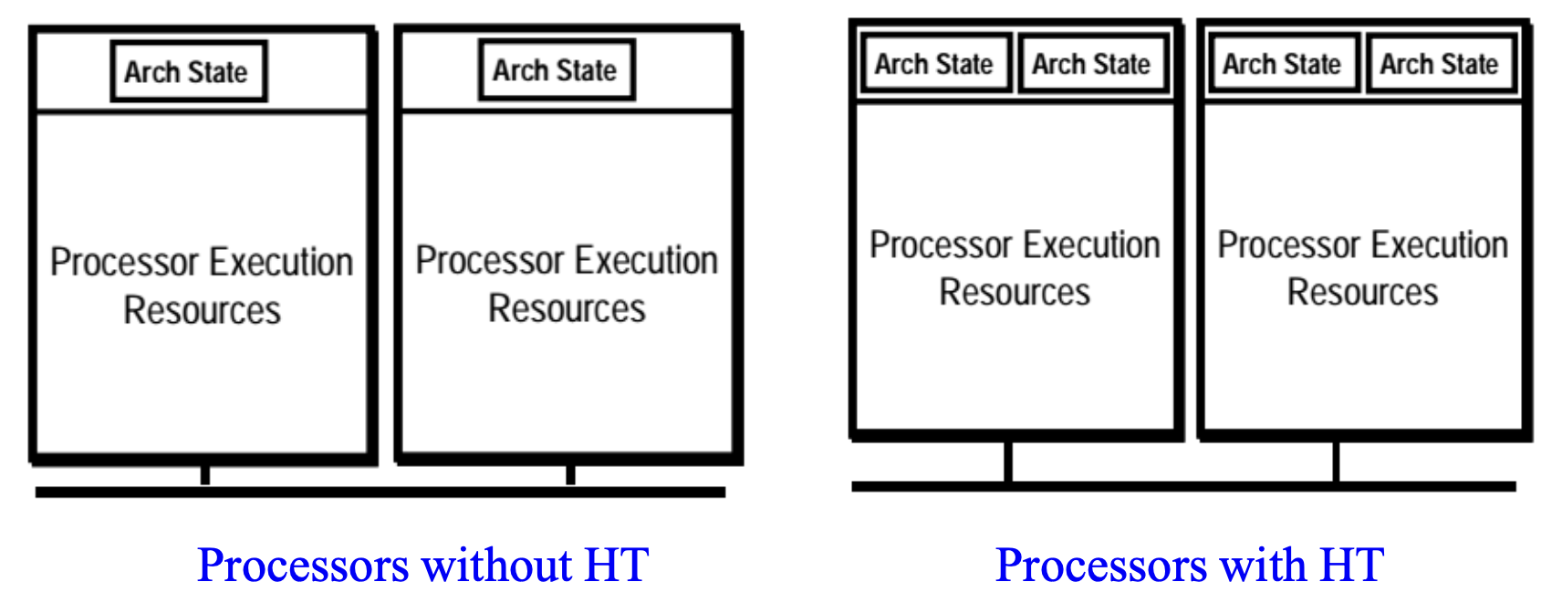 - 逻辑处理器共享物理处理器上几乎所有其他资源,例如缓存、执行单元、分支预测器、控制逻辑和总线