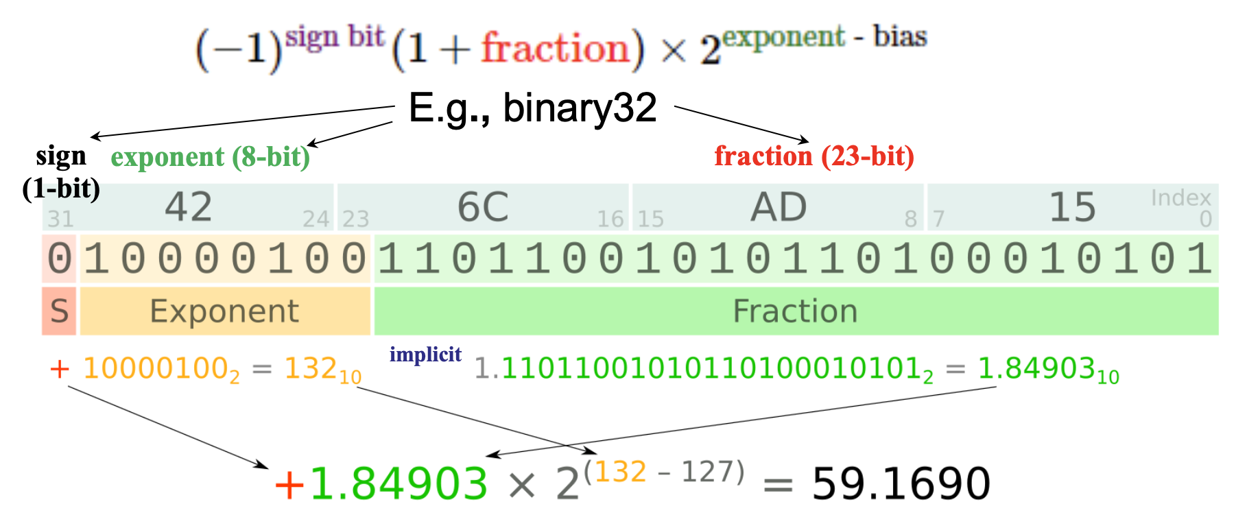 - 偏移指数(biased exponent):偏移量加在指数上,方便比较指数;全 0 和全 1 代表特殊值