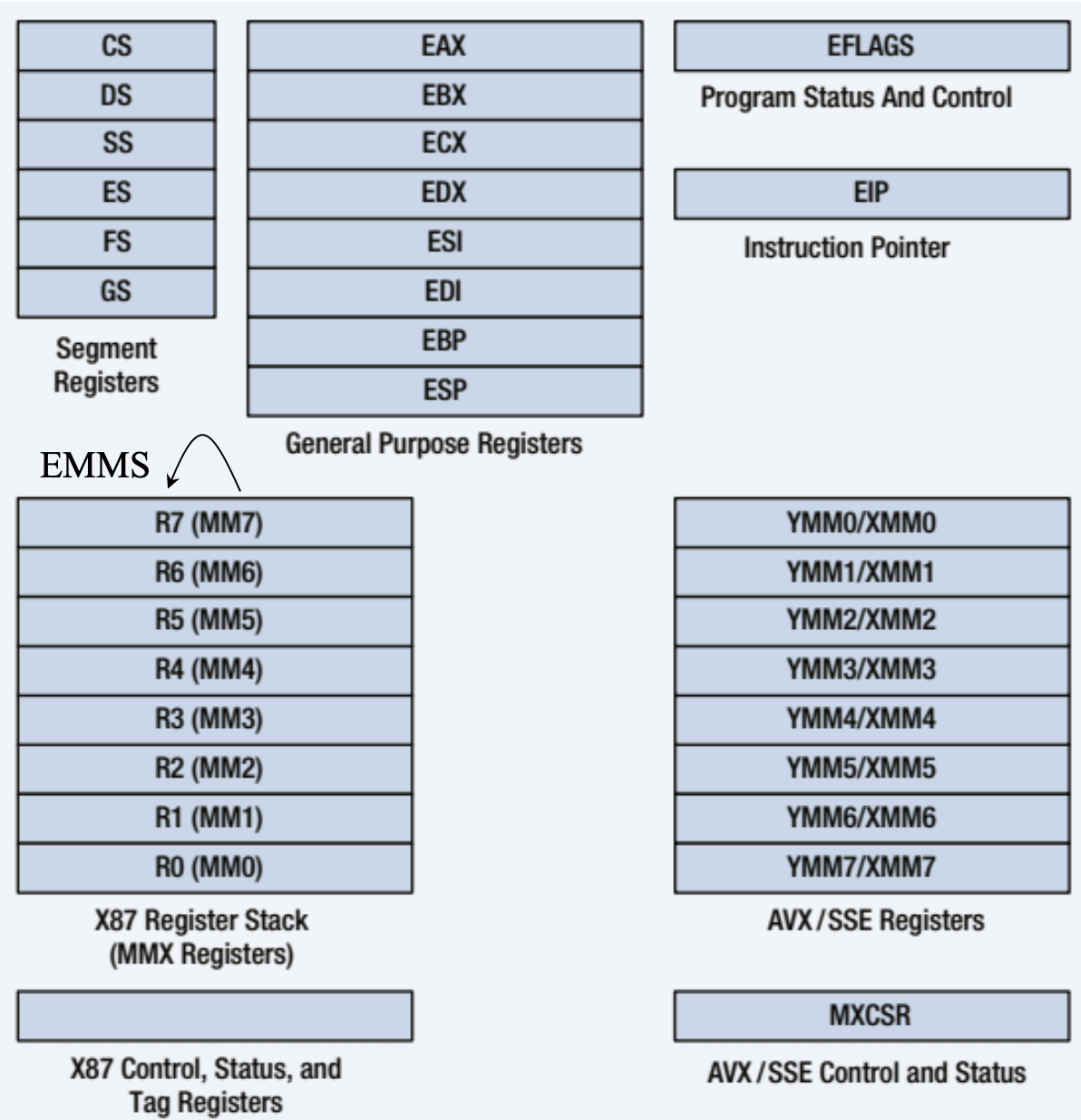 在编写程序或调查指令前,必须要知道微处理器的内部配置。在一个多核微处理器中,每个核包含了相同的编程模型,并且同时运行一个独立的任务或线程。编程模型可分为: