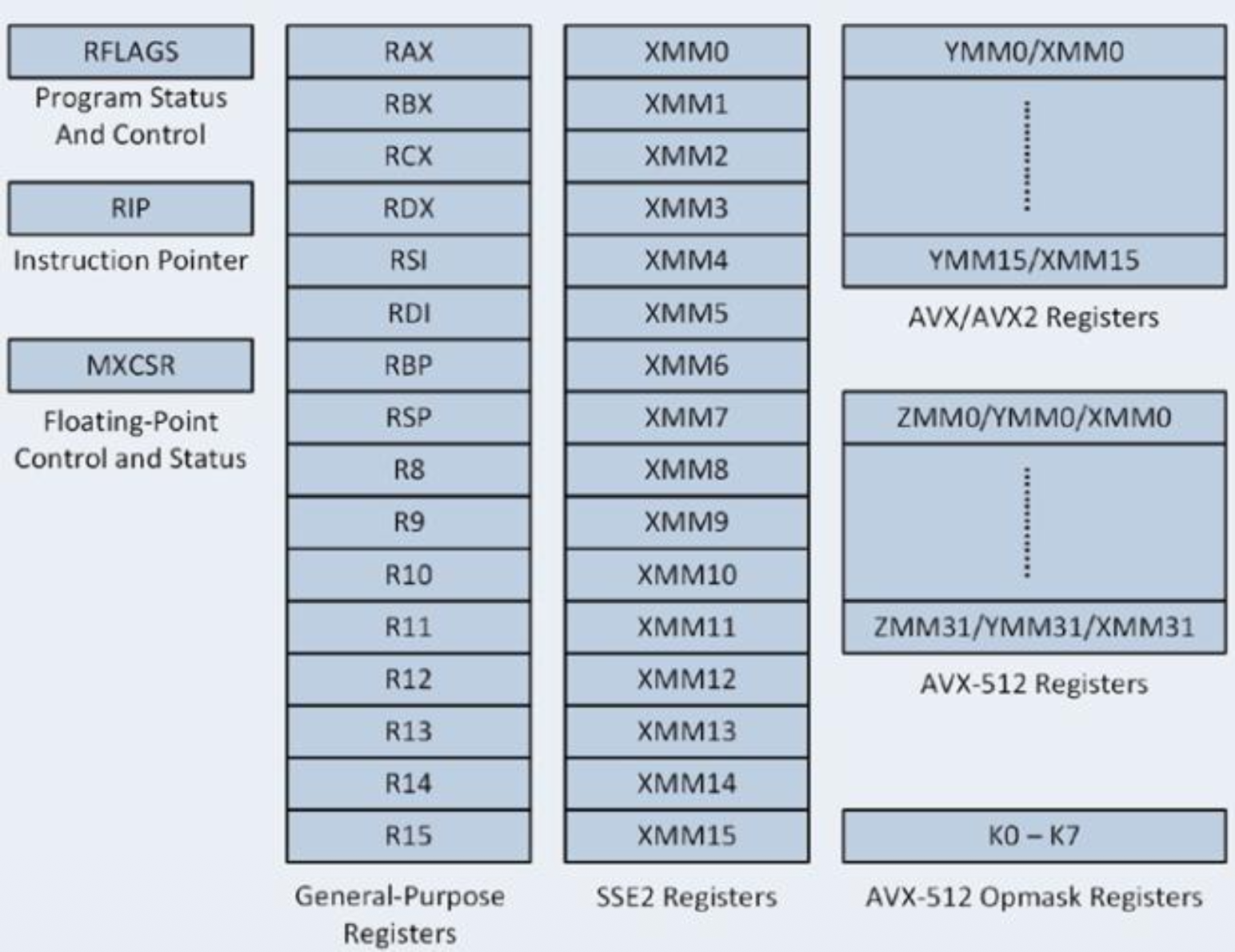 RAX,RBX,RCX,RDX,RDI,RSI,RBP,RSP,R8-R15