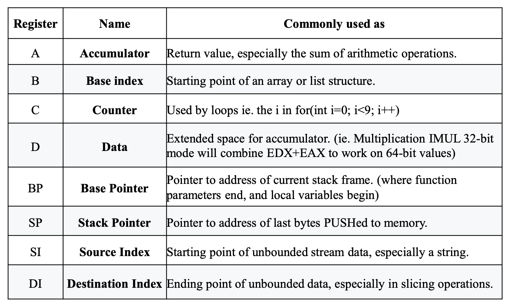 EAX,EBX,ECX,EDX,EDI,ESI,EBP,ESP,R8D-R15D - 16 个 64 位低字节寄存器: