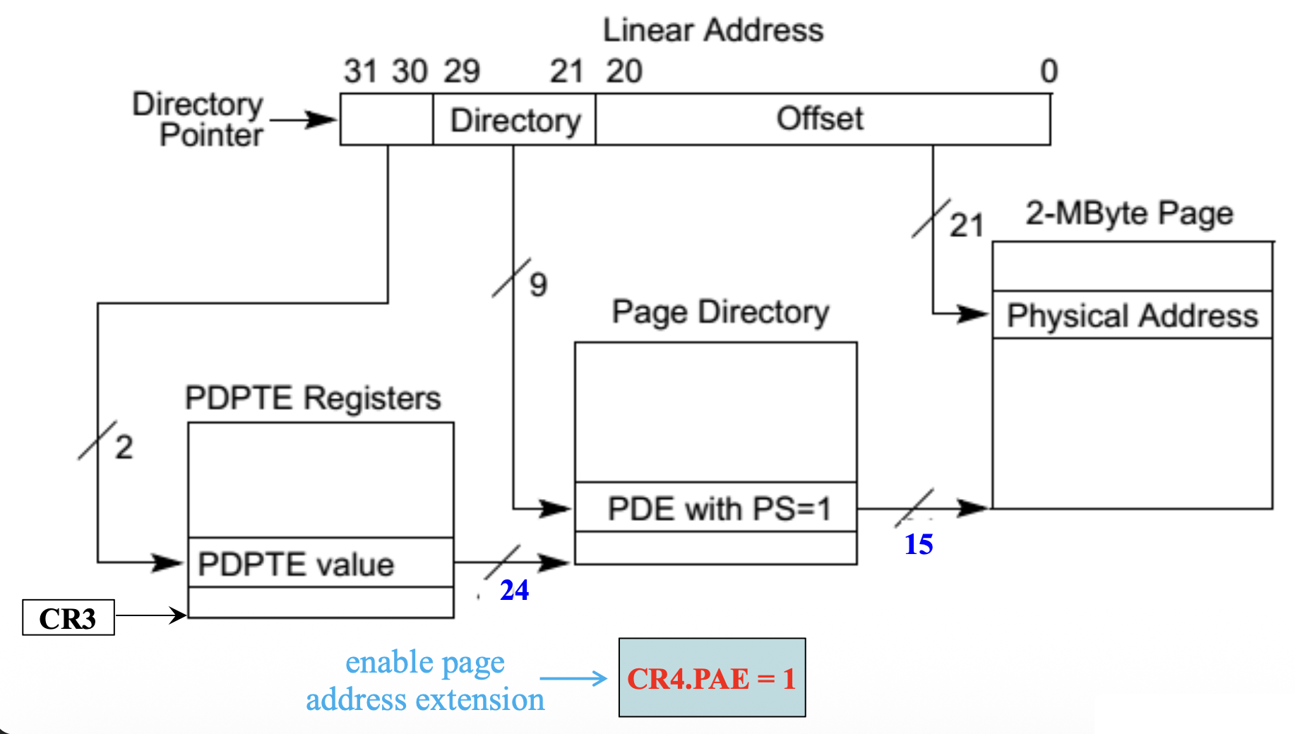 PAE 的 2 MB 页映射:移除第三级页表,产生 2 MB 大小的页,并且设置 CR4.PAE = 1 且 PDE.PS = 1。