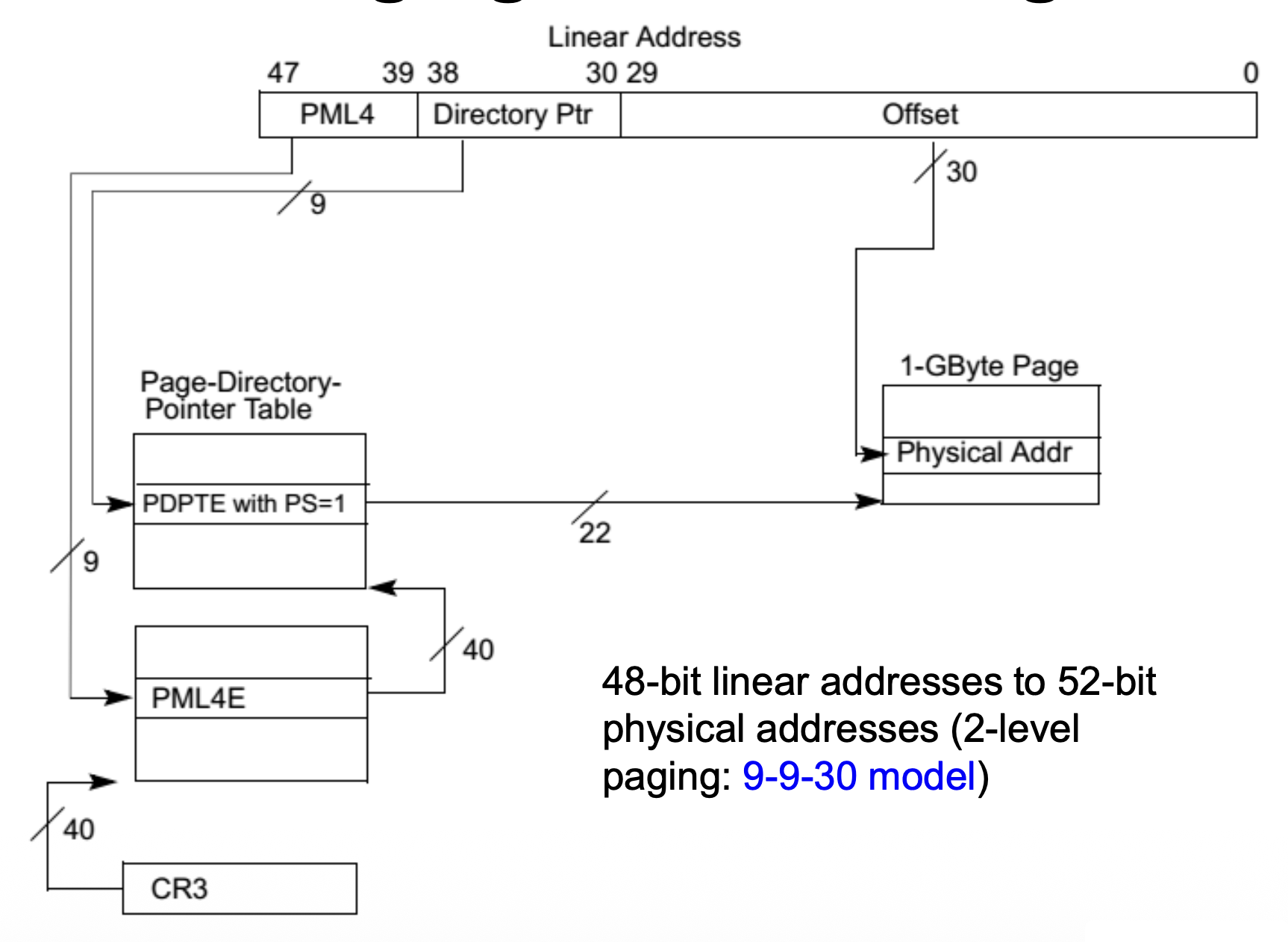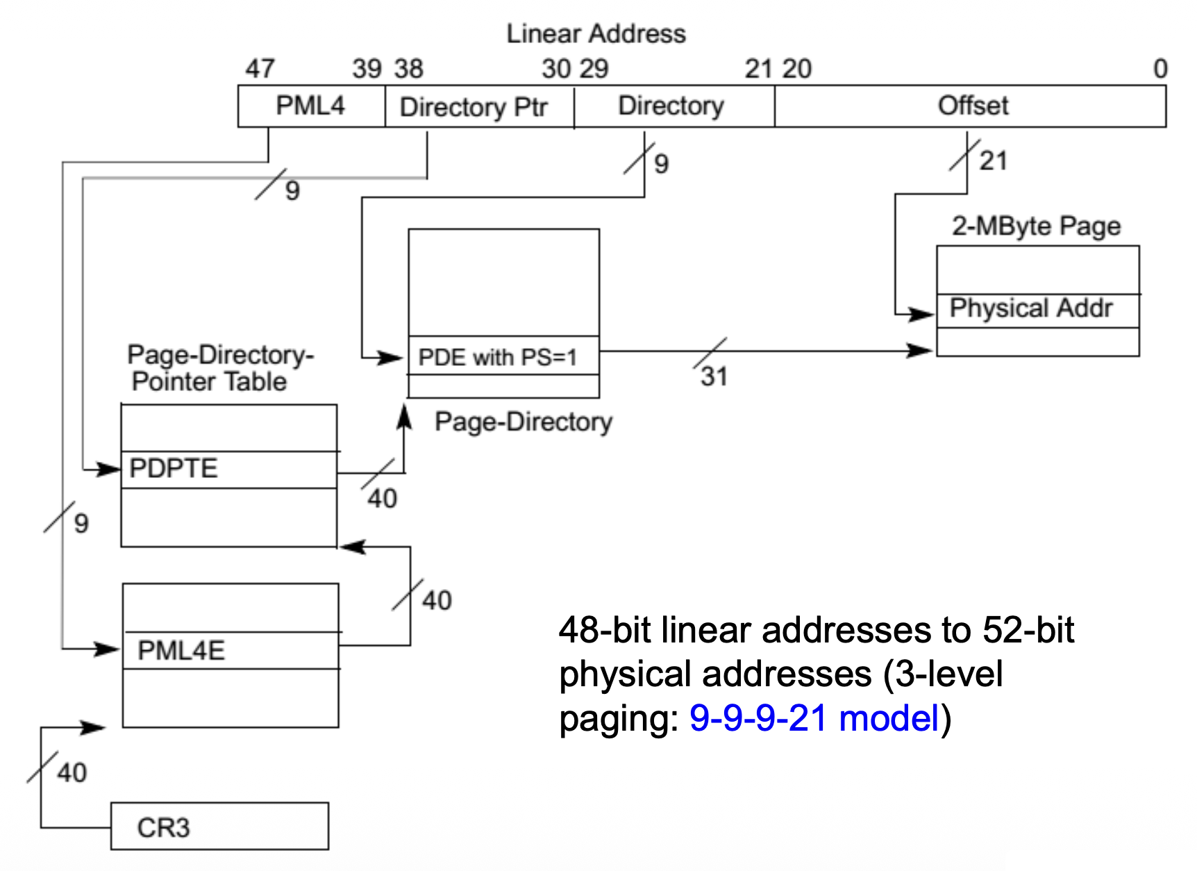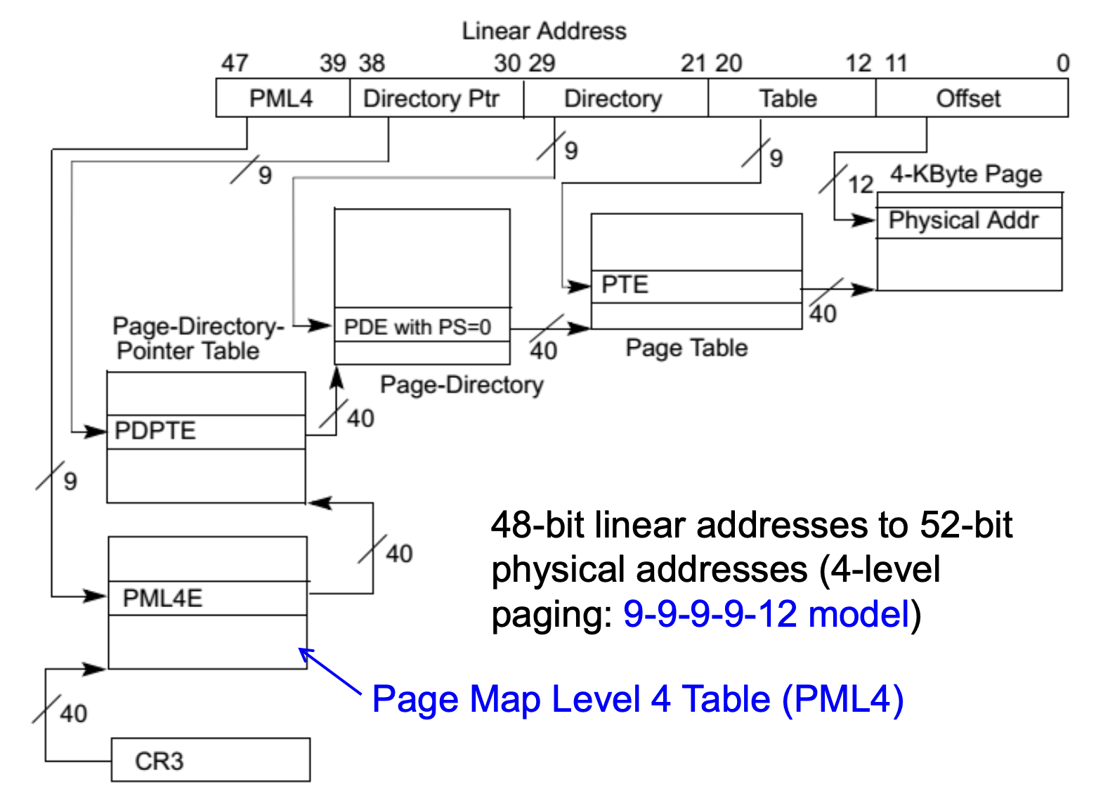 - 4 级分页:将 48 位线性地址转换为 52 位物理地址
