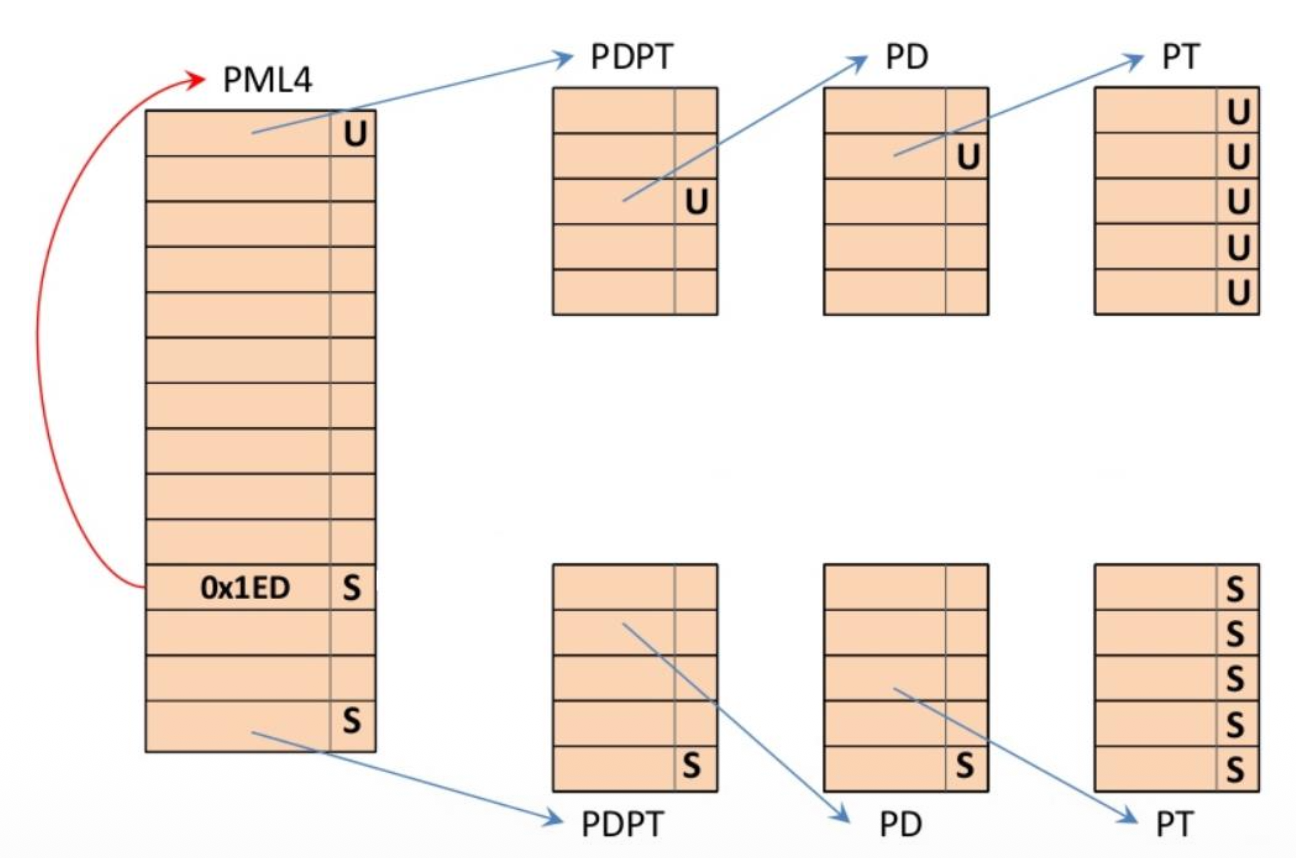 - Windows 64 位系统在最顶层的 PML4 页表中有一个特殊条目(