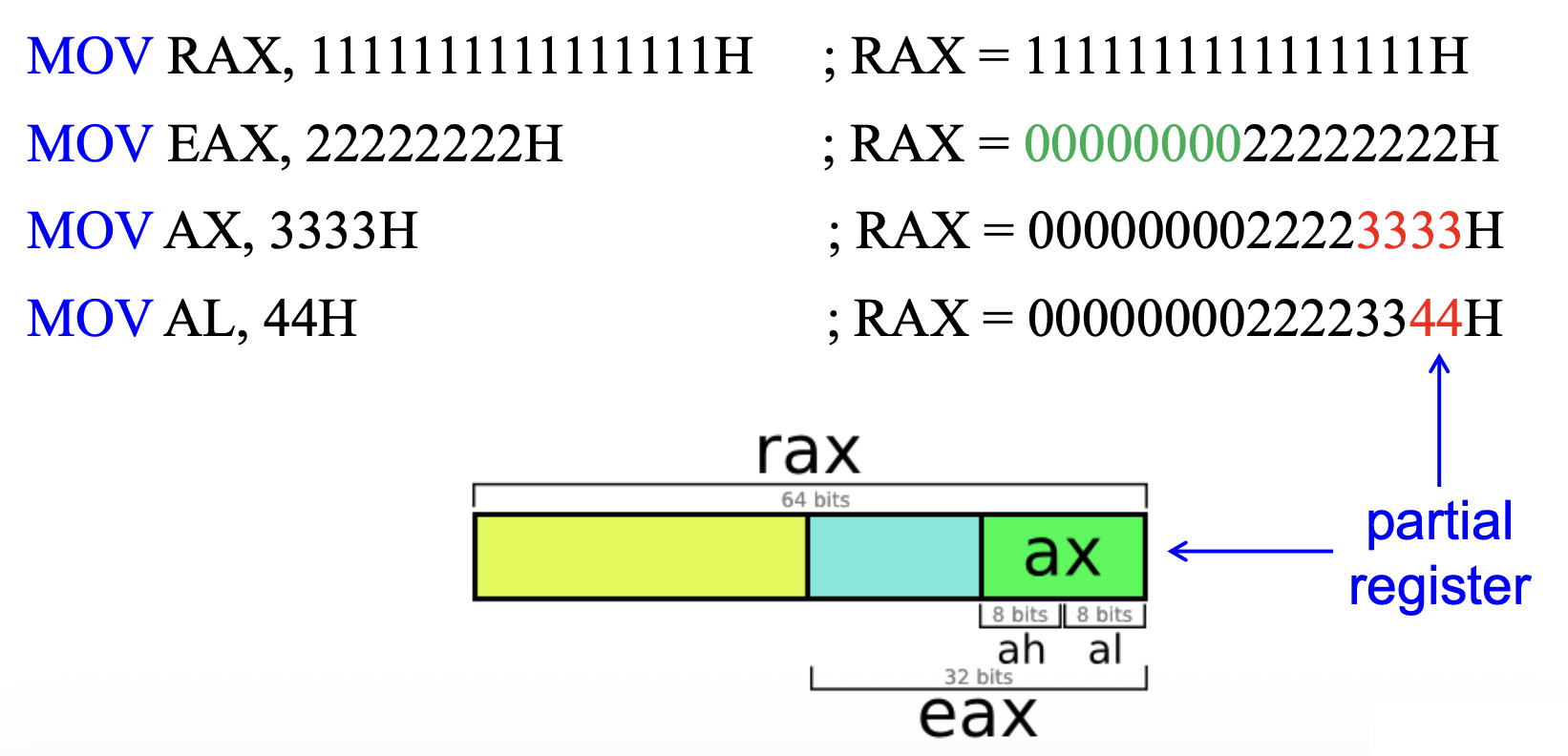 注意:修改 32 位部分寄存器会将寄存器的其余部分(第 32-63 维)设置为 0,但修改 8 位或 16 位部分寄存器不会影响寄存器的其余部分