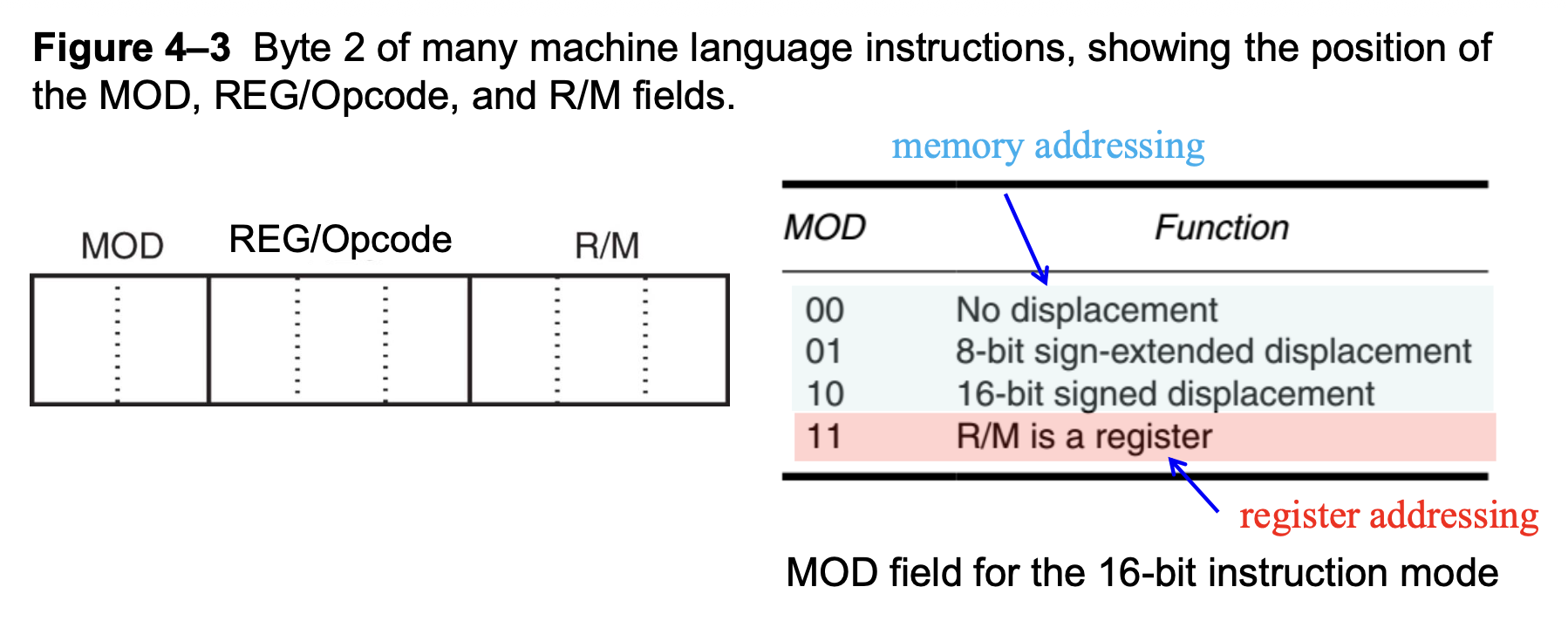 - 如果 MOD 字段包含 11,则选择的是寄存器寻址模式,此时会使用 R/M 字段来指定一个寄存器