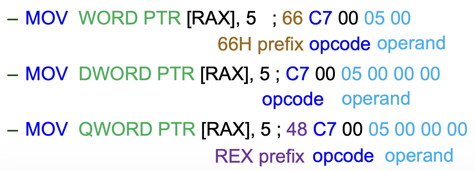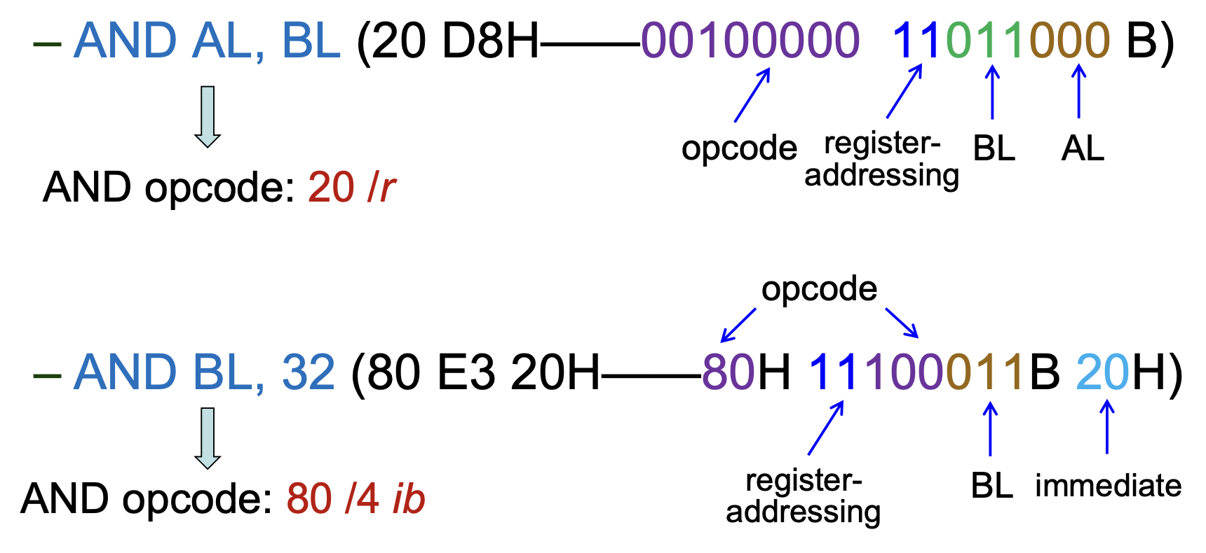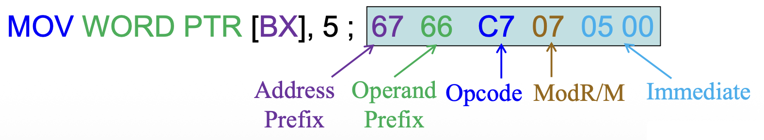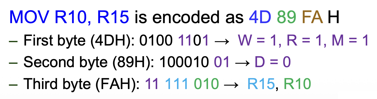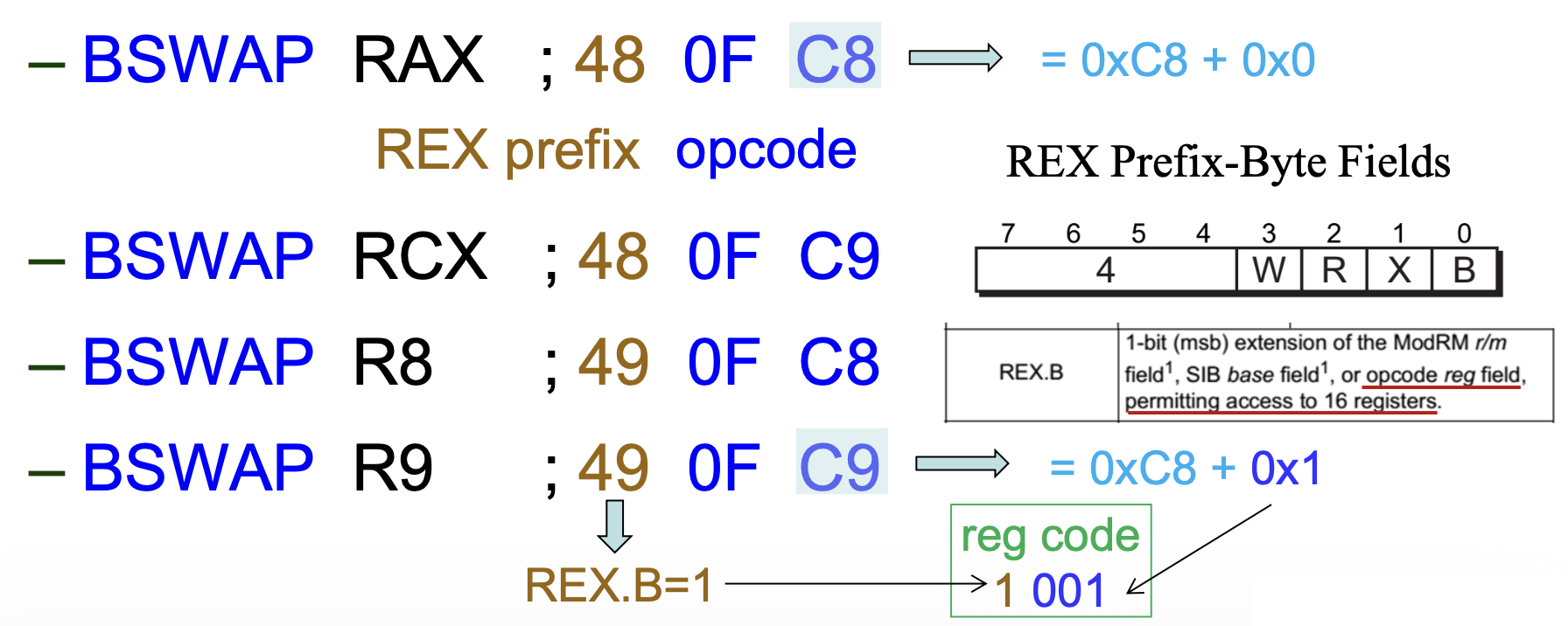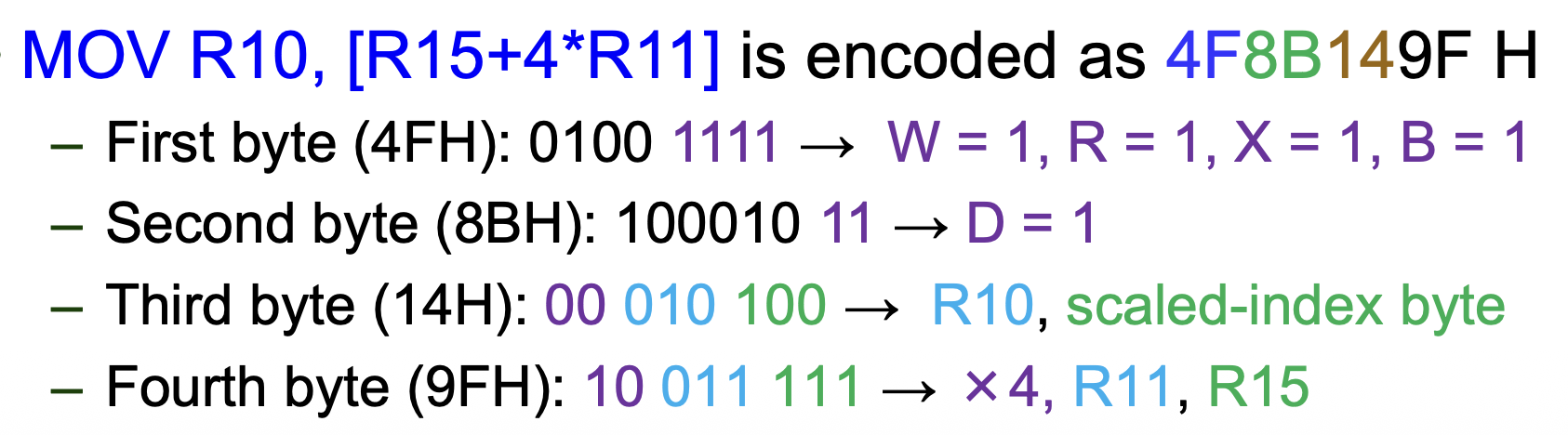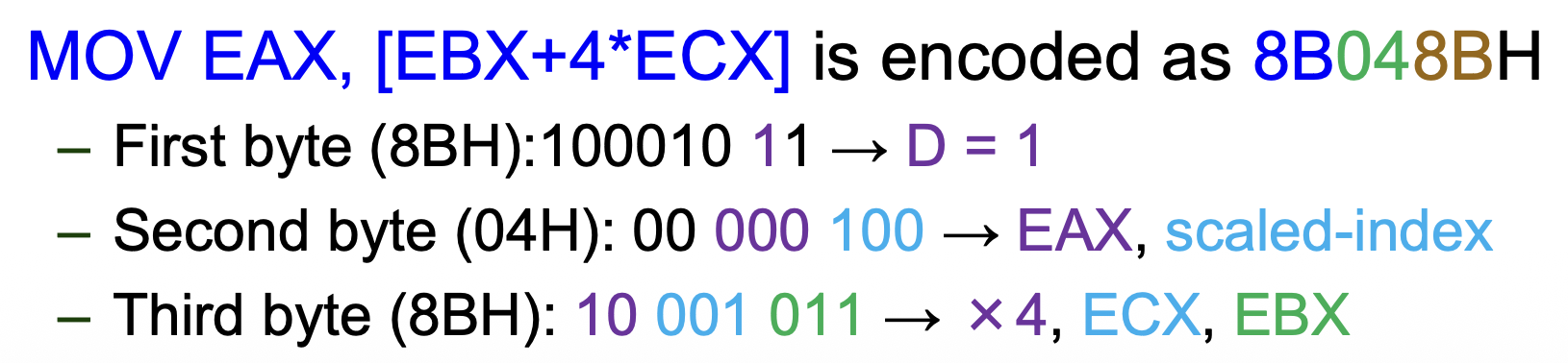 - 指令以小端序(little-endian) 存储在内存中,即指令的第一个字节存储在最低的内存地址上