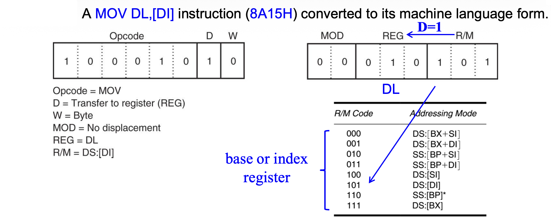 下图展示了 16 位指令 MOV DL,[DI](8A15H)的机器码: