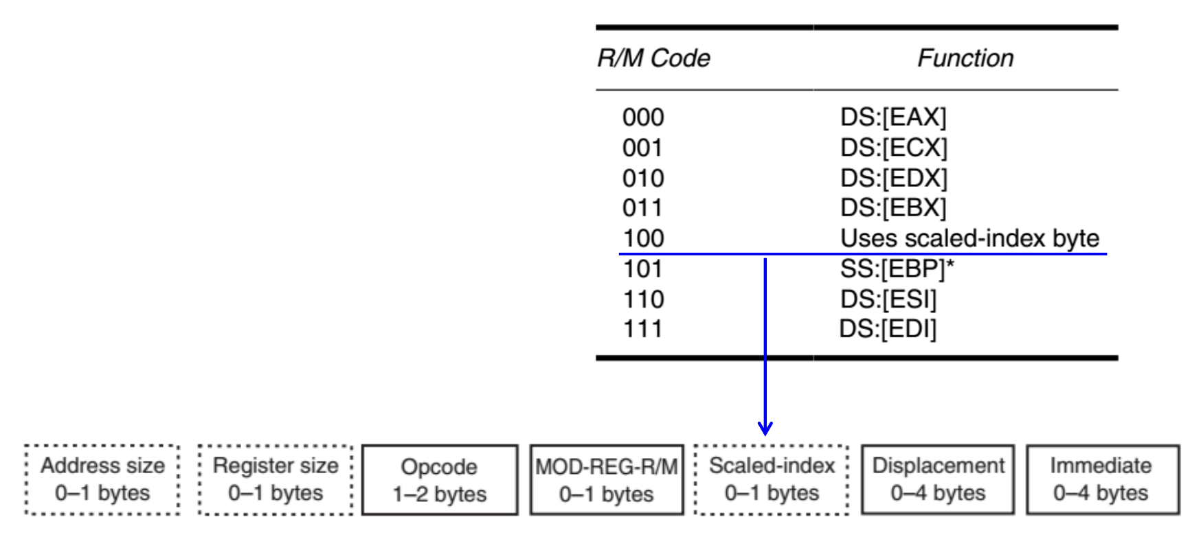 当 R/M = 100 时,一个叫做比例变址字节(scaled-index byte) 的额外字节出现在指令中,表示比例变址寻址的额外形式。