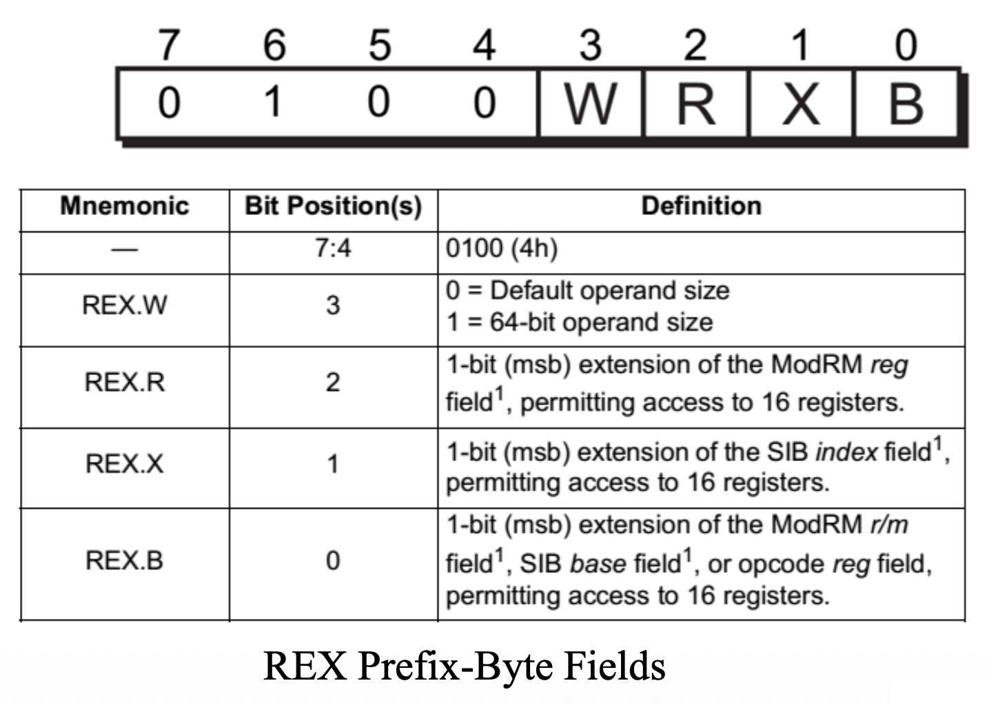 - REX 包含五个字段:高四位是 REX 前缀独有的,作为标识;低四位分为四个 1 位字段(W、R、X、B)