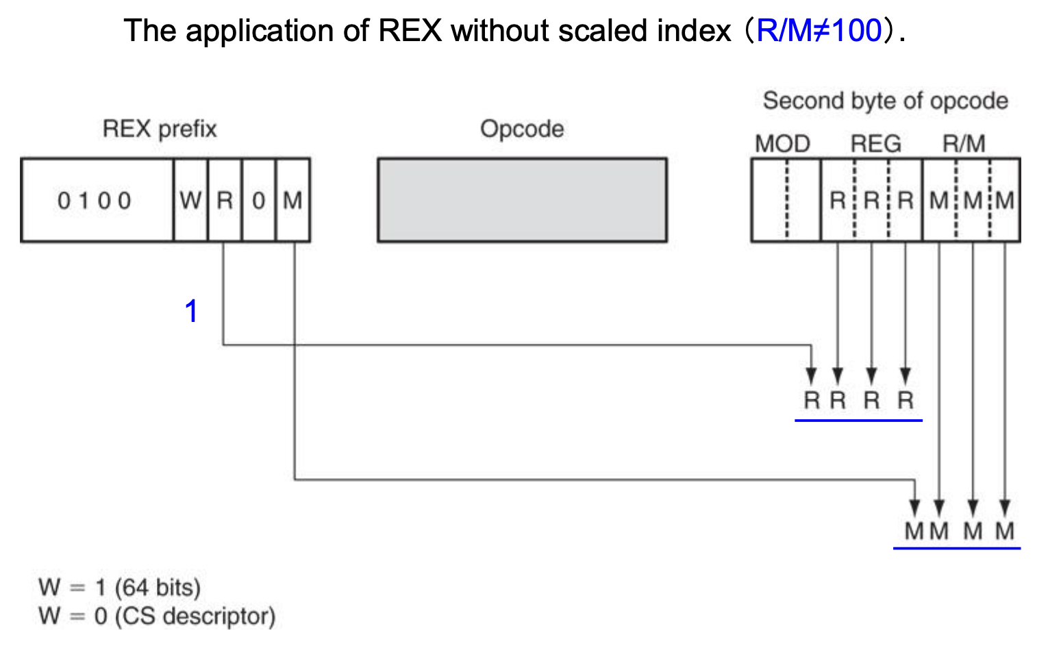 下图说明了 REX 在操作码第二个字节的结构和应用: