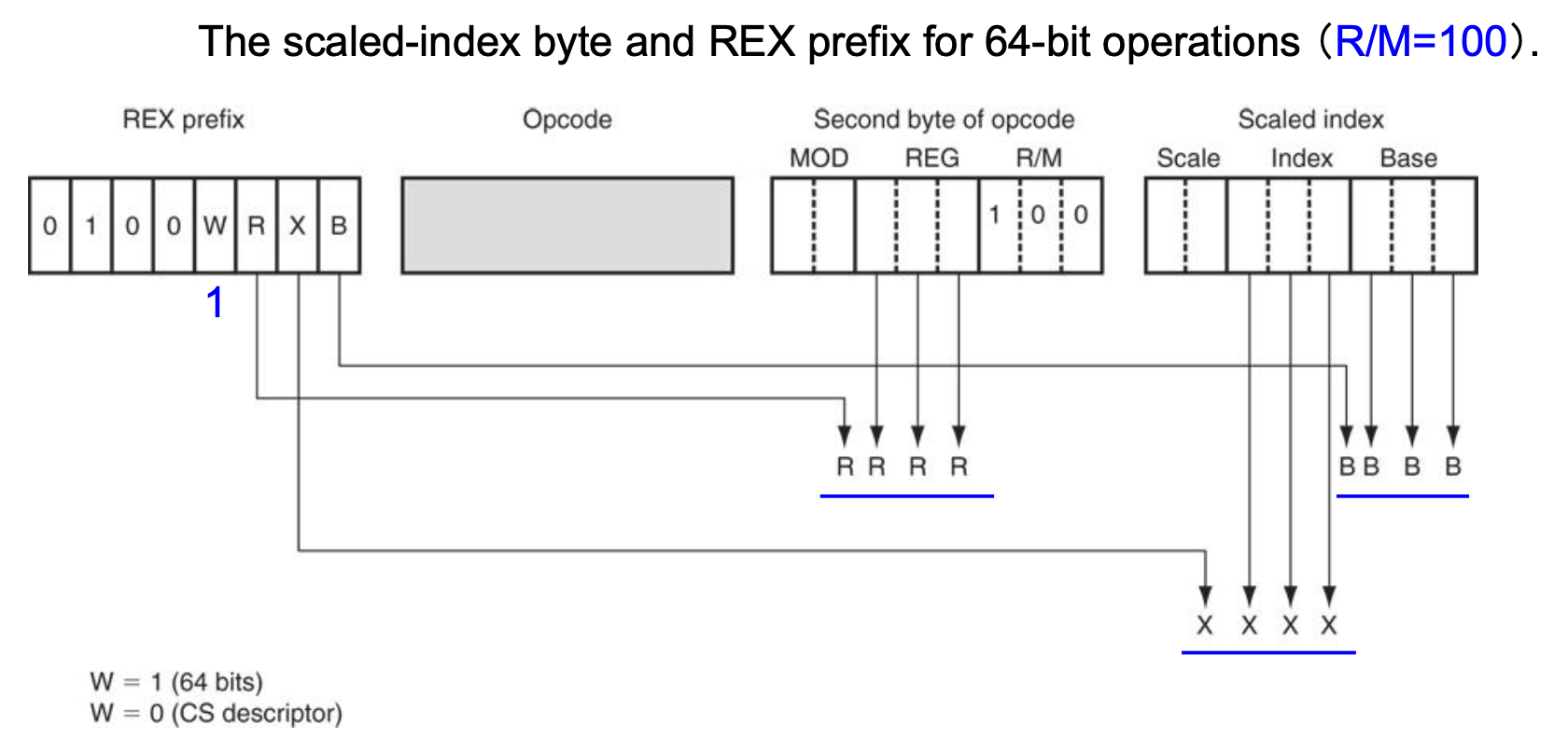 下图展示了带有 REX 前缀的比例变址字节,用于更复杂的寻址模式: