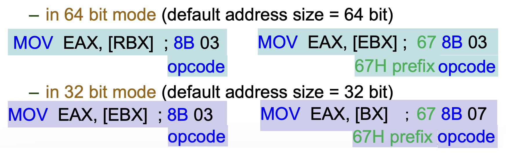 操作数大小前缀 66H 选择了非默认的操作数大小,而地址大小前缀 67H 改变了内存操作数的默认地址大小。