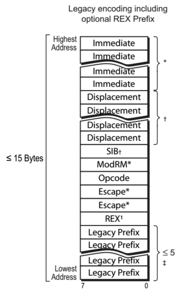 - 总的指令长度不超过 15 个字节,超出限制的话就会触发通用保护异常(general-protection exception)