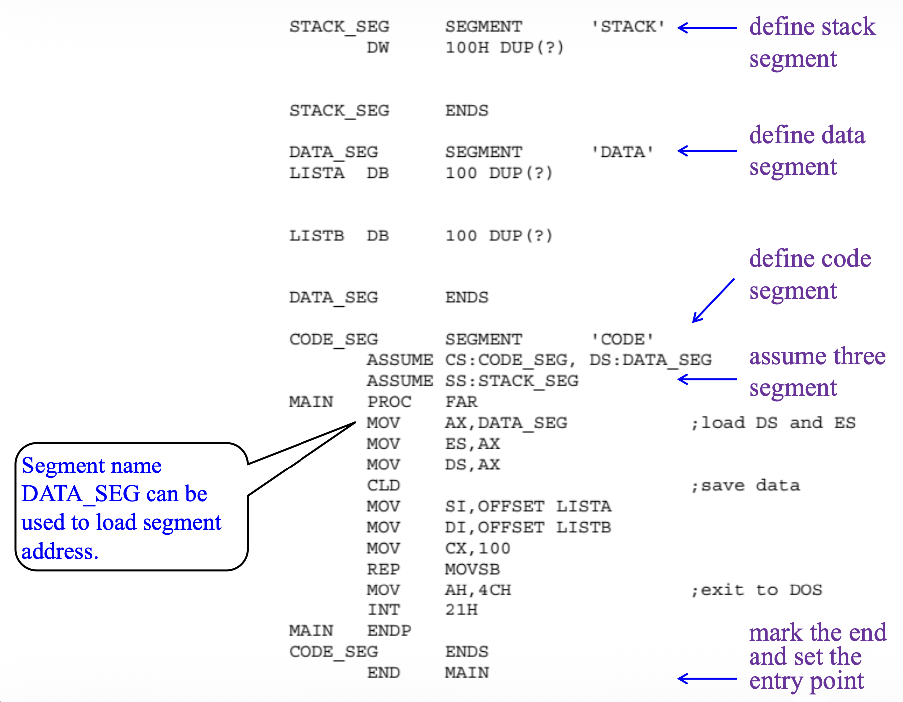 - 一种方法使用全段定义(full-segment definitions):提供了对汇编语言任务的更好的控制,建议用于复杂程序