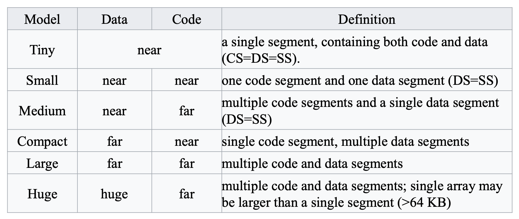 .MODEL指示符包括 MASM 实模式下六个内存模型,即tiny、small、compact、medium、large和huge- 对于保护模式,有一个模型
