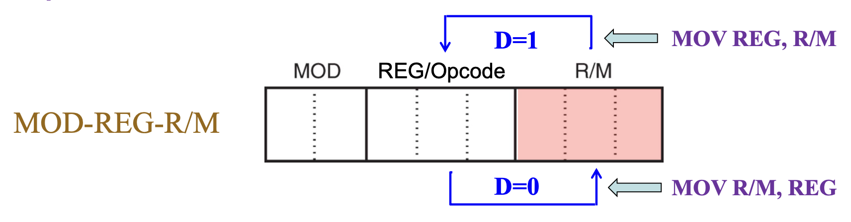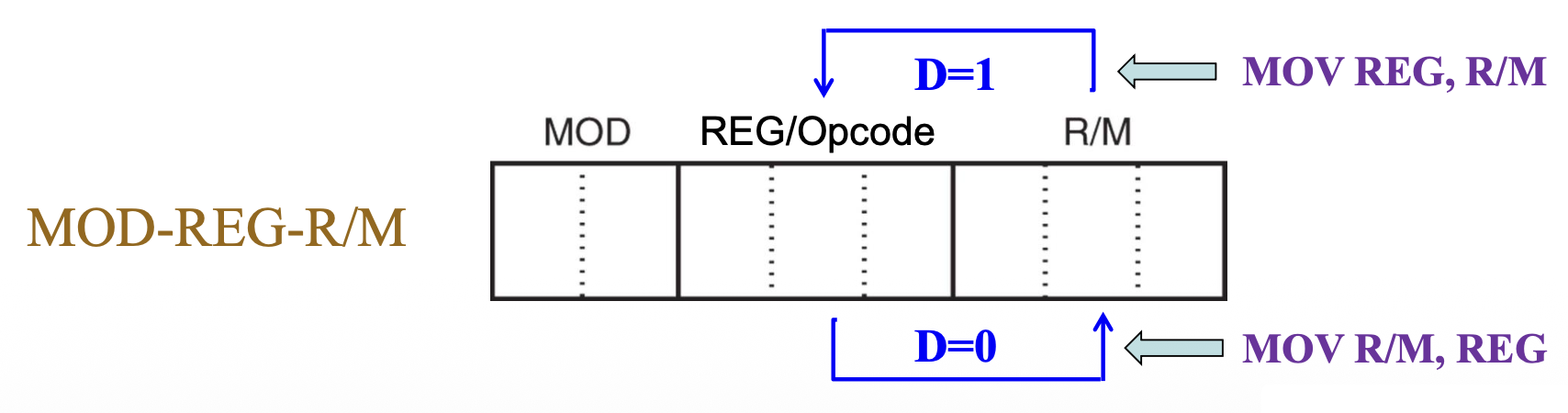 - Opcode = 100010,D = 1,W = 0,MOD = 00,REG/Opcode = 010(