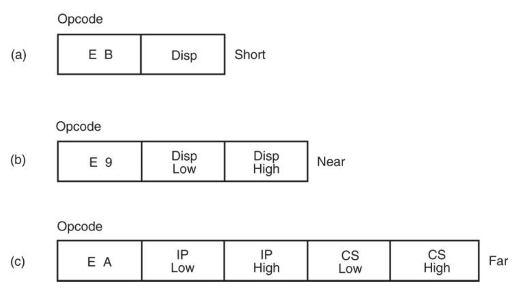 - 近跳(near jump):3 字节指令,允许跳转到在当前代码段中的指令 ±32 KB 范围内的地方