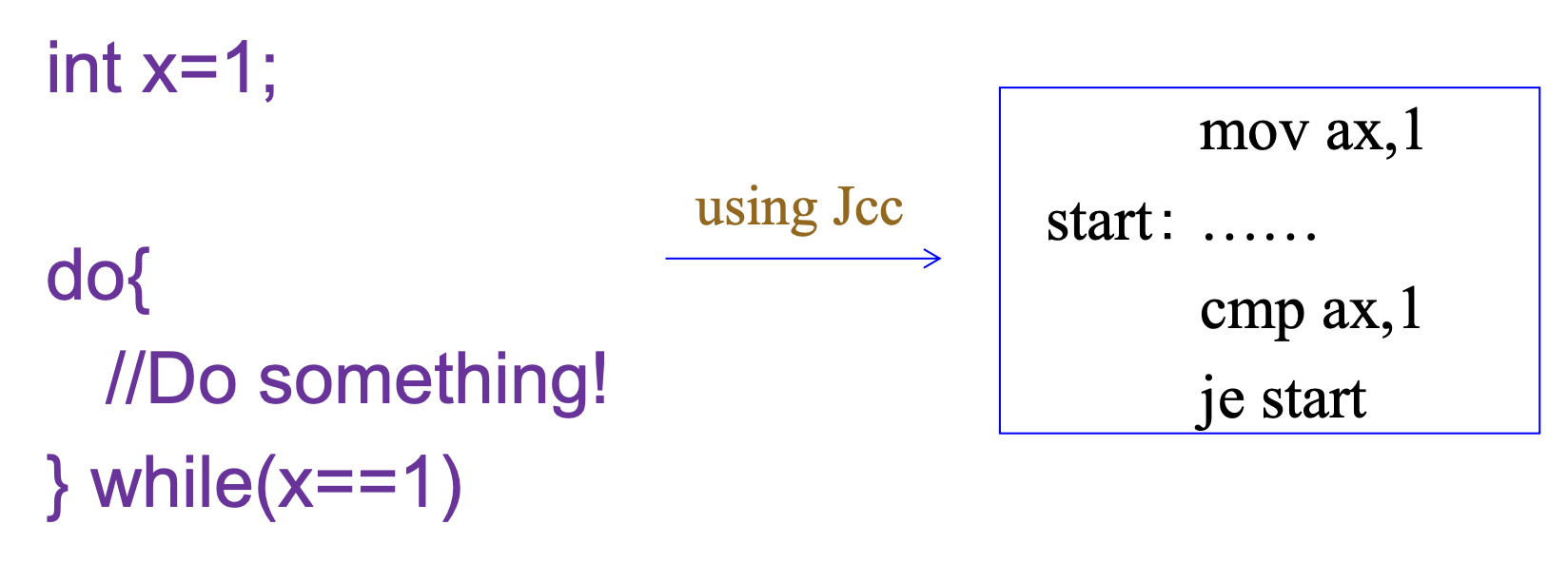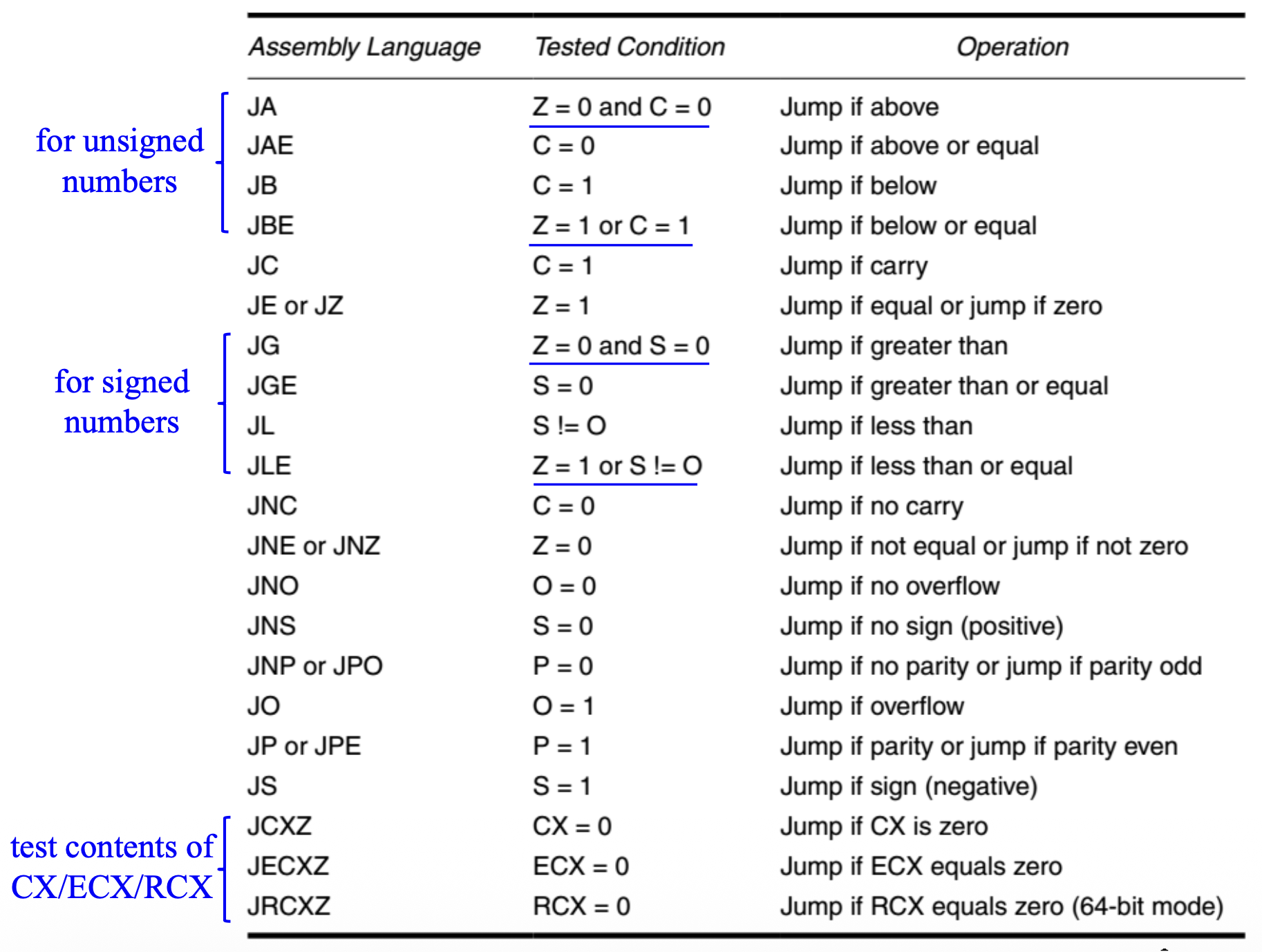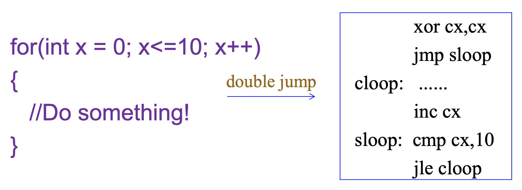 - 通过无条件或条件跳转(unconditional / conditional jump) 指令,能跳过程序段,并跳转到内存的任何部分以执行下一条指令