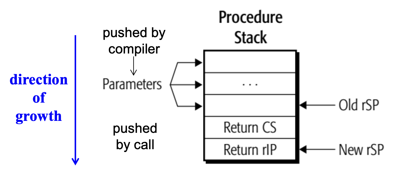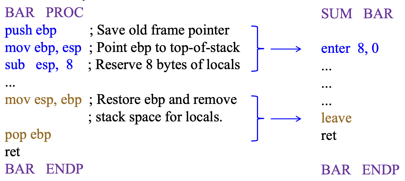 ENTER和LEAVE指令为被调用的过程创建和释放栈帧- 栈帧(stack frame)(也称为激活帧 (activation frame) 或激活记录 (activation record))是一种内存管理技术,用于支持过程的执行