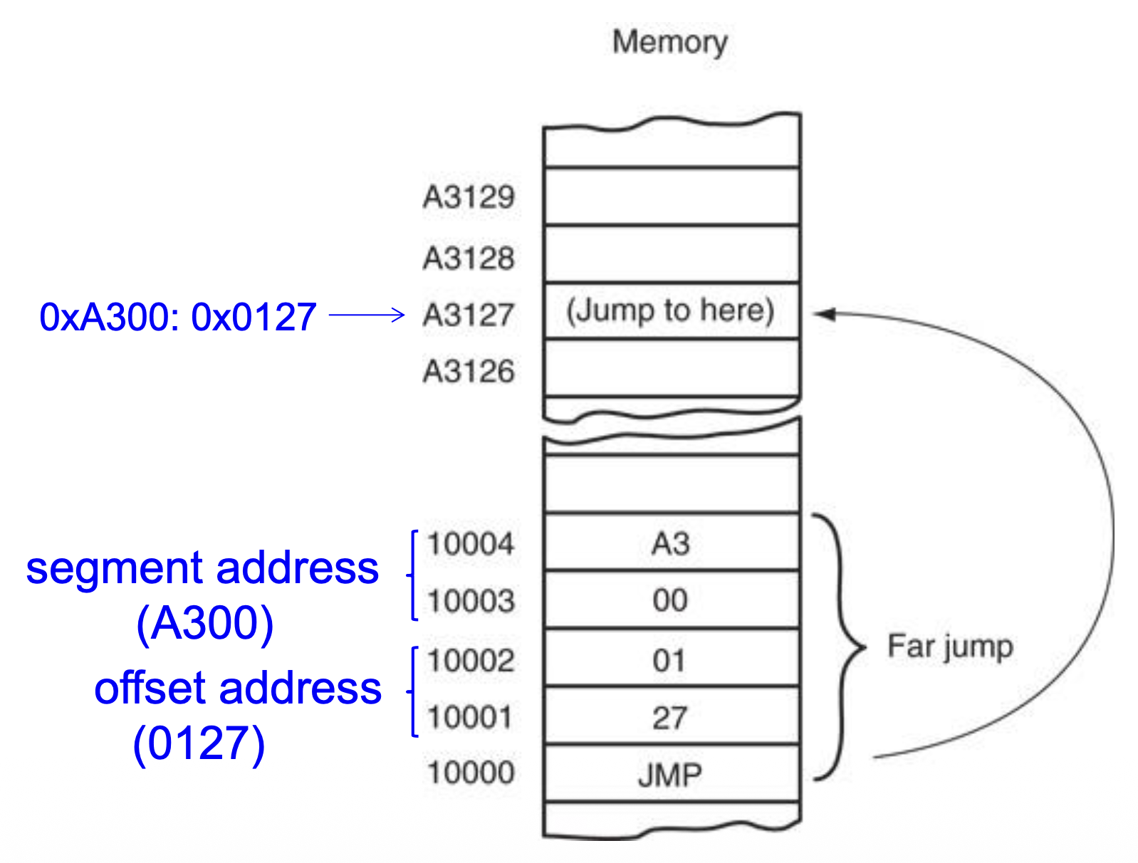 - 远跳(far jump):5 字节指令,允许跳转到在真实内存系统上的任意位置