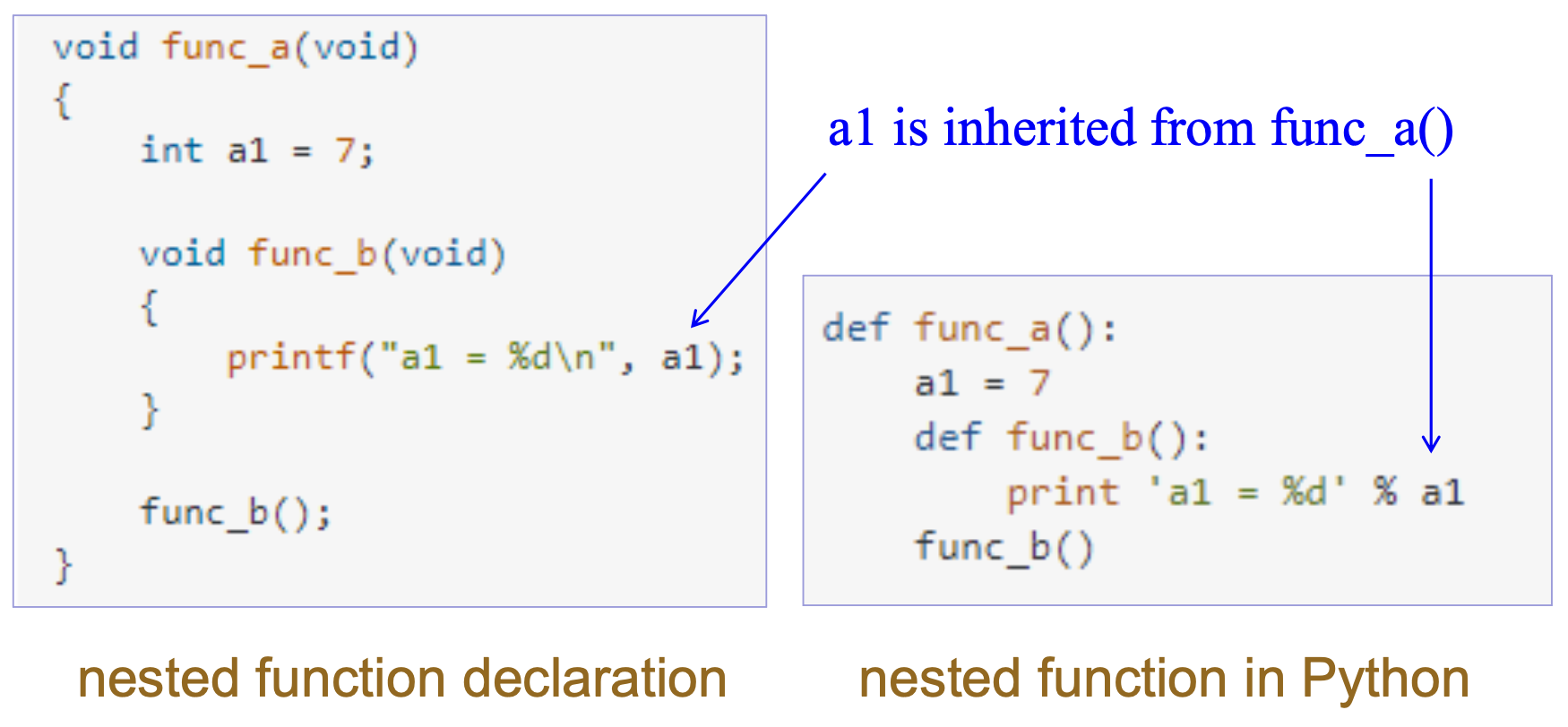 嵌套函数不被标准 C 支持,局部变量仅在其声明的函数范围内有效