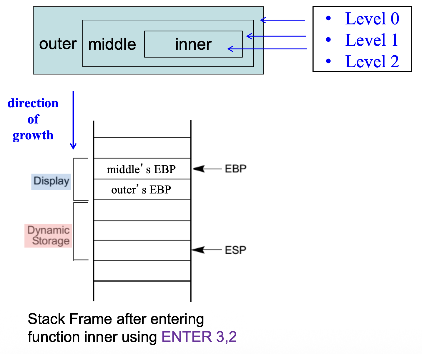 - 嵌套级别决定了在调整栈指针之前,从前一个帧复制到新栈帧的栈帧指针数量,这允许从被调用函数访问多个父帧