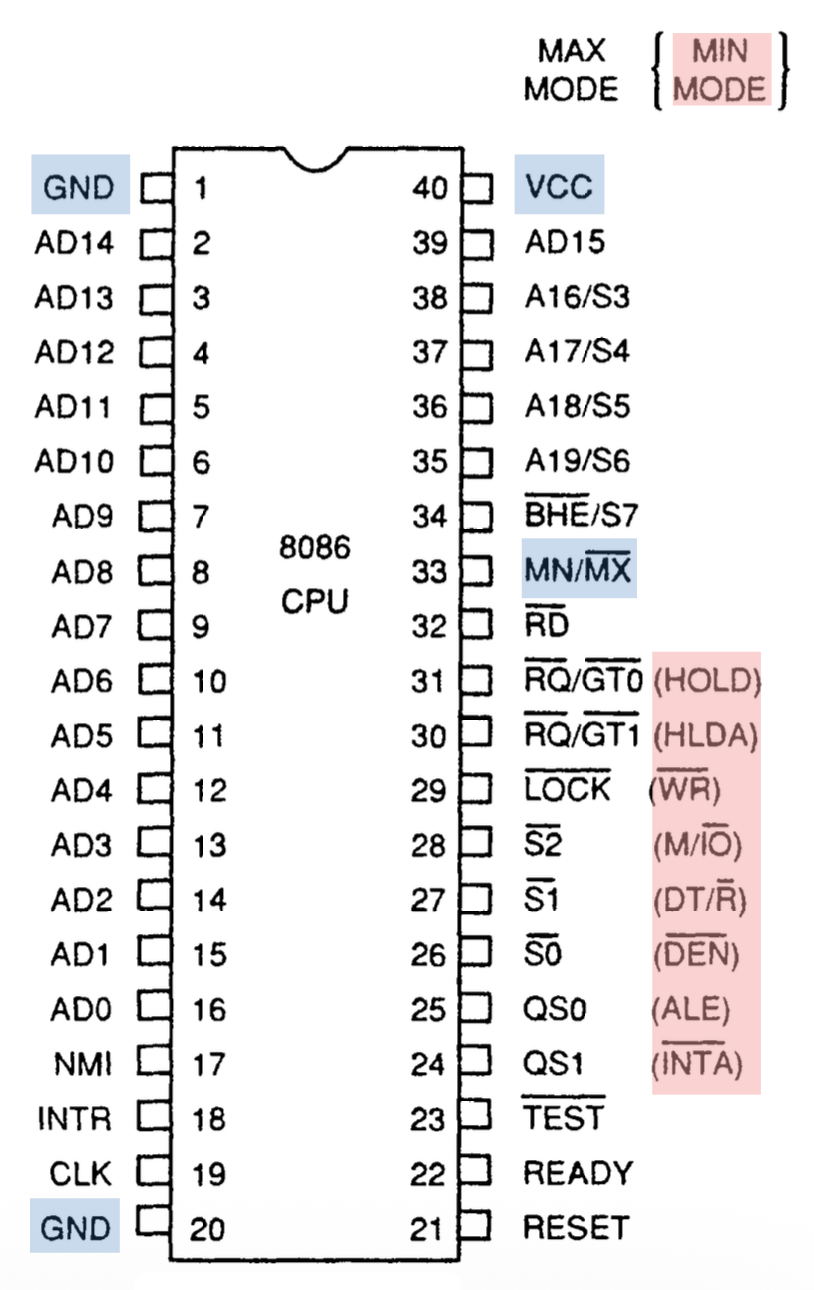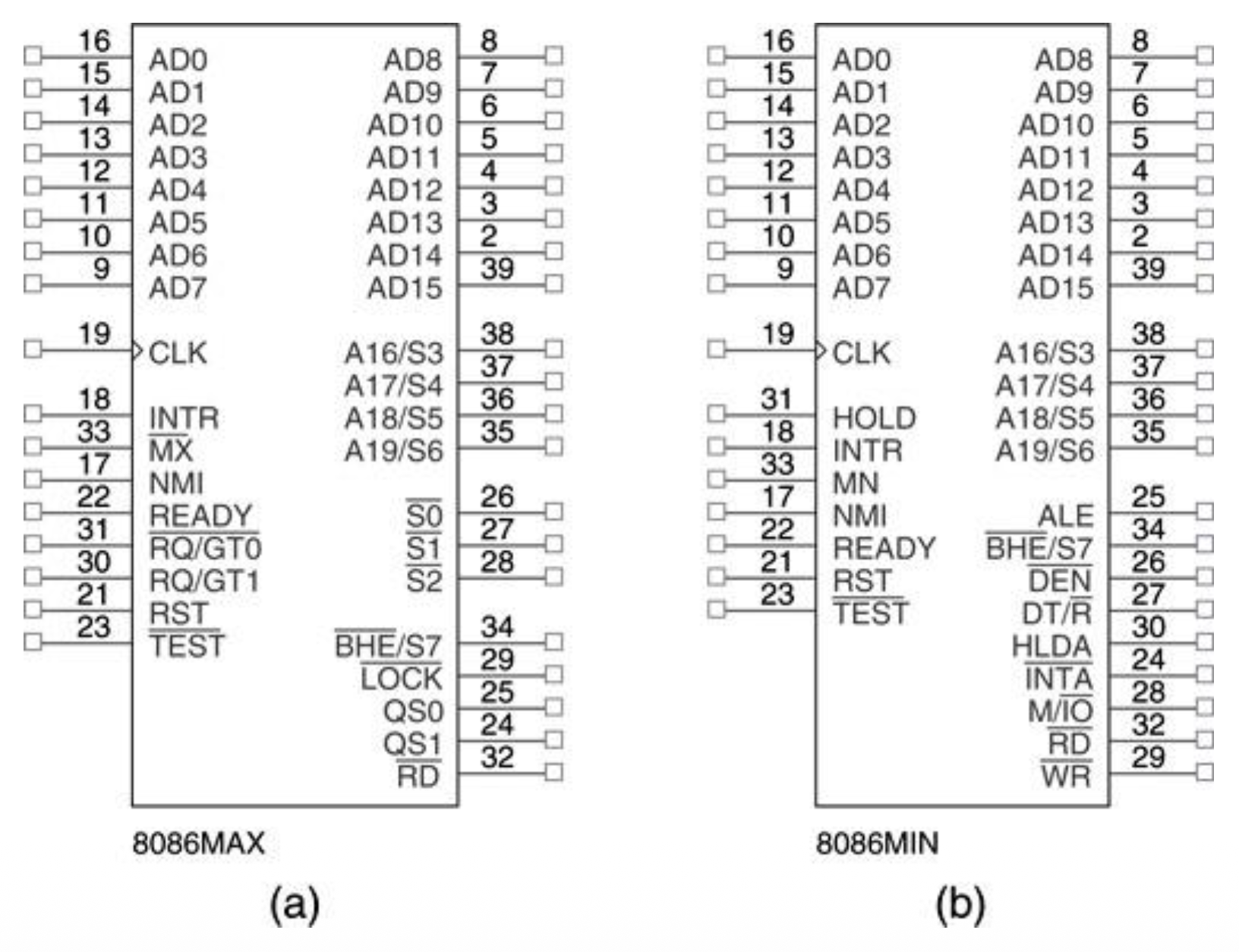 最小模式引脚 \(\text{IO}/\overline{\text{M}}\) (8088)或 \(\text{M}/\overline{\text{IO}}\)(8086)选择内存或 I/O